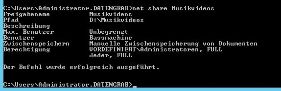 Wenn ich auf dem Server "net share Musikvideos" aufrufe (die Freigabe aus obigem Screenshot), bekomme ich Folgendes: