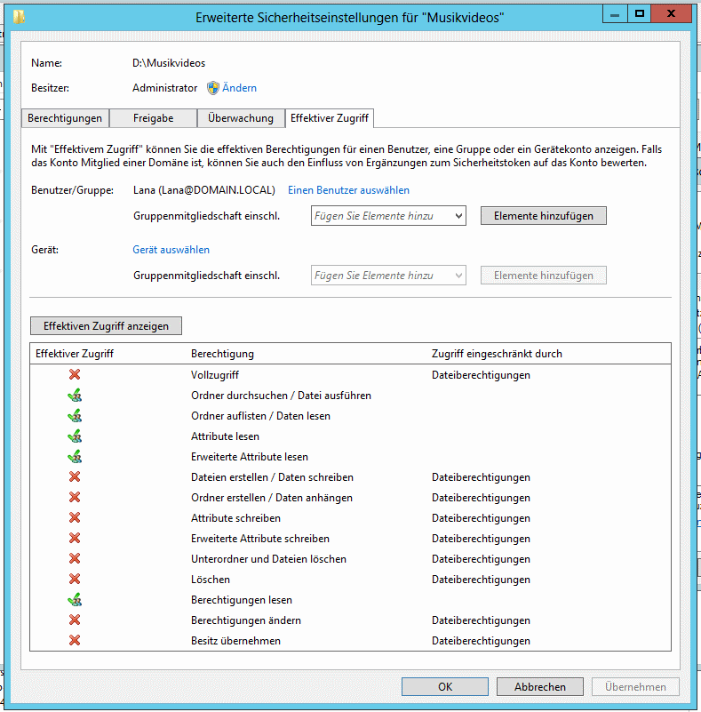 DomUser unterscheiden sich bei den Gruppenmitgliedschaften von den DomAdmins darin, dass die Admins zur Builtin-Gruppe Administratoren gehören, die User zur Builtin-Gruppe Benutzer. Adde ich die DomUser noch zu den Administratoren, können die DomUser die Freigaben lesen. Leider können sie dann auch Inhalte bearbeiten, was ausdrücklich nicht erwünscht ist.