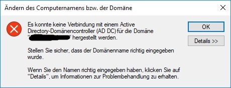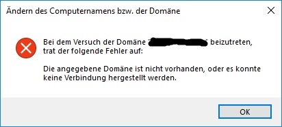 Das Problem am ganzen ist jetzt, dass egal von welchem PC ich es probiere; egal ob Windows 10, oder 7; ich bekomme keine Verbindung zur Domain. Wenn ich den Domainnamen ändere, kommt beim ersten Beitrittsversuch zwar das Fenster zur Eingabe der Anmeldedaten, aber danach die Fehlermeldung 1. Danach kommt immer nur noch die Fehlermeldung 2.