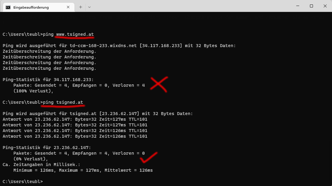 Also, ich habe mit WIX eine Homepage erstellt. Diese ist mit einer Domain (tsigned.at) verbunden. Die Seite funktioniert auch schon eine Zeitlang ohne Probleme. Plötzlich ist die Seite (Domain) NUR von meinem Netzwerk zuhause (5 Rechner per LAN, Laptop und Smartphones per WLAN) nicht mehr erreichbar. Ich bekomme immer eine "ERR_CONNECTION_TIMED_OUT". Die WIX Bearbeitung und Vorschau funktioniert.