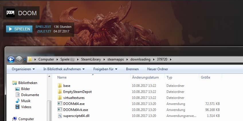 ich habe DOOM allein auf einer 111 GB SSD installiert. Als ich nun nach Wochen mal wieder spielen will, wird mir gemeldet, dass der Speicherplatz für ein neues Update nicht ausreichen würde. Ich schaue mir die Ordner an, und sehe, dass der Downloading-Ordner mit ca. 20 GB gefüllt ist. Ich hab den Ordner einfach mal entleert, und dann stelle ich im "Computer" fest, dass der freie Speicherplatz stetig wieder abnimmt, obwohl ich keinen downstream habe. Und am Ende ist der Download Ordner wieder mit 20 GB gefüllt, obwohl wie gesagt nichts heruntergeladen wurde.