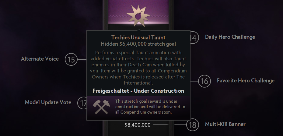 TI4 hat nun ein Preisgeld von 6 Mio $ erreicht, damit wurden alle Ziele erreicht, und das nach gerade einmal 10 Tagen. 1,6Mio $ wurden von Valve gestellt, der Rest von der Community beigetragen. Absoluter Wahnsinn.