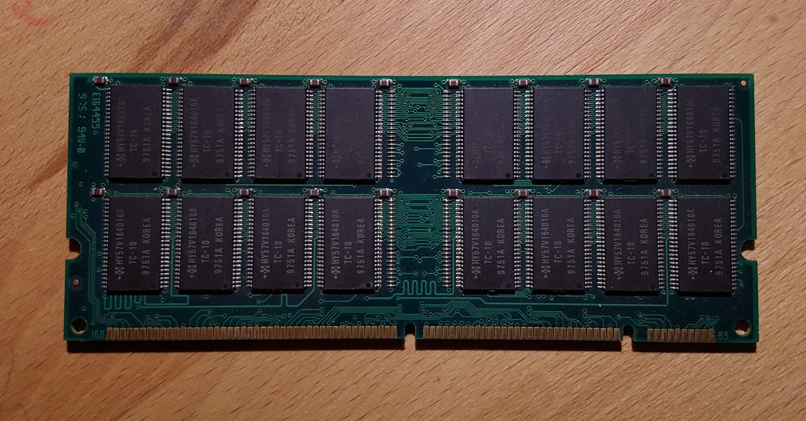 64MB EDO RAM, beidseitig bestückt, 18 Chips pro Seite, ist fast doppelt so hoch wie ein damaliger normaler EDO-RAM Riegel mit hochkant stehenden Chips.