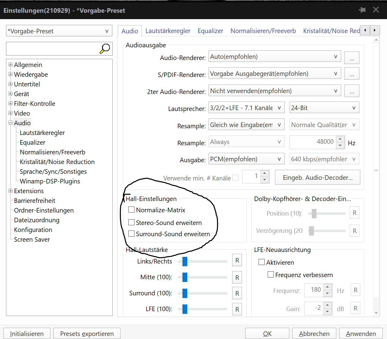 Wie viel Kanal hat den das Ausgangsmaterial?MSI-MATZE schrieb:Gesteuert und bei Pot Player verwende ich für die Kopfhörer die Einstellung für die Kopfhörer 7.1 denke Das ist die Richtige Einstellung in Verbindung mit HeSuVi