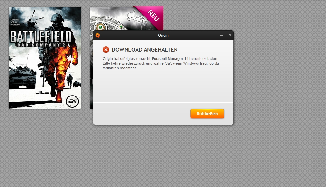 Folgendes, ich hab gestern nach ewiger Zeit mal wieder Origin benutzt und mir über GameLaden den Key für den Fussball Manger 2014 besorgt. Produkt-Code einlösen war dann auch noch kein Problem, allerdings immer wenn ich jetzt den Download aus Origin starten möchte, erhalt ich nach 15 Sekunden die Meldung