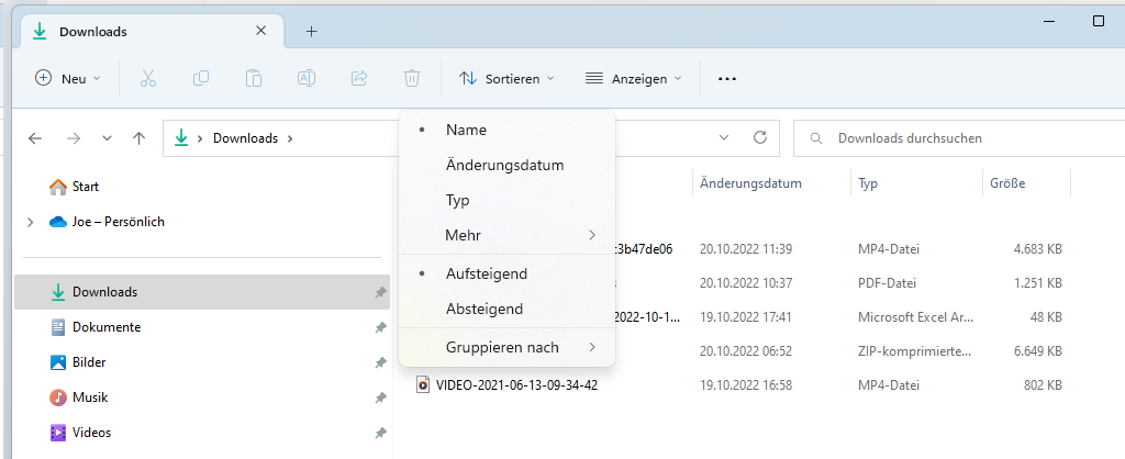 ich habe gerade das unerklärliche Problem, dass der Explorer unter Windows 11 (neuste Version, alle Updates eingespielt) immer neue Ordner die ich im Ordner Downloads anlege nach dem Änderungsdatum sortieren will und nicht nach dem Dateinamen.