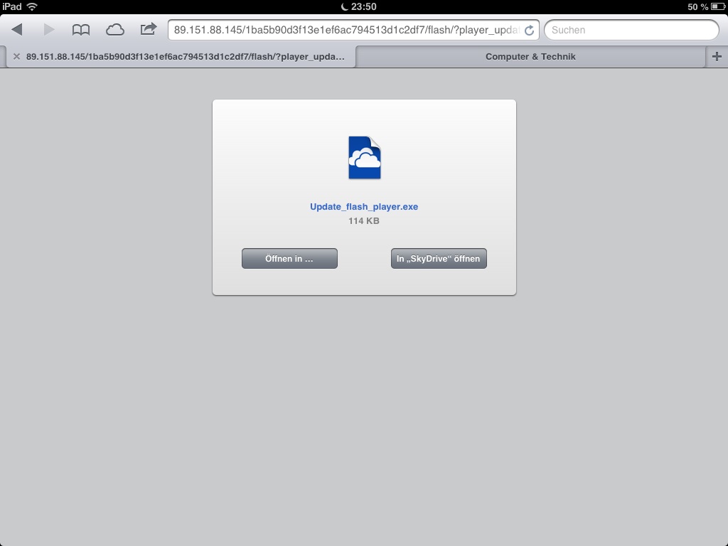 Die zum Download angebotete Datei ist höchstwahrscheinlich Malware, also bitte nicht öffnen. (Auf dem iPad ist das ja ohnehin nicht möglich, aber vielleicht sehen auch Windows-Nutzer diese Meldung.)