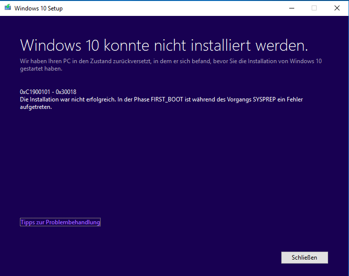 Das Herunterladen und vorbereiten des Updates läuft ohne Probleme. Es erfolgt die Meldung für den Systemneustart und daraufhin der blaue Screen indem die Installation bis ca. 30% durchläuft. Dann erfolgt wieder ein Neustart und damit geht´s dann leider nicht weiter.