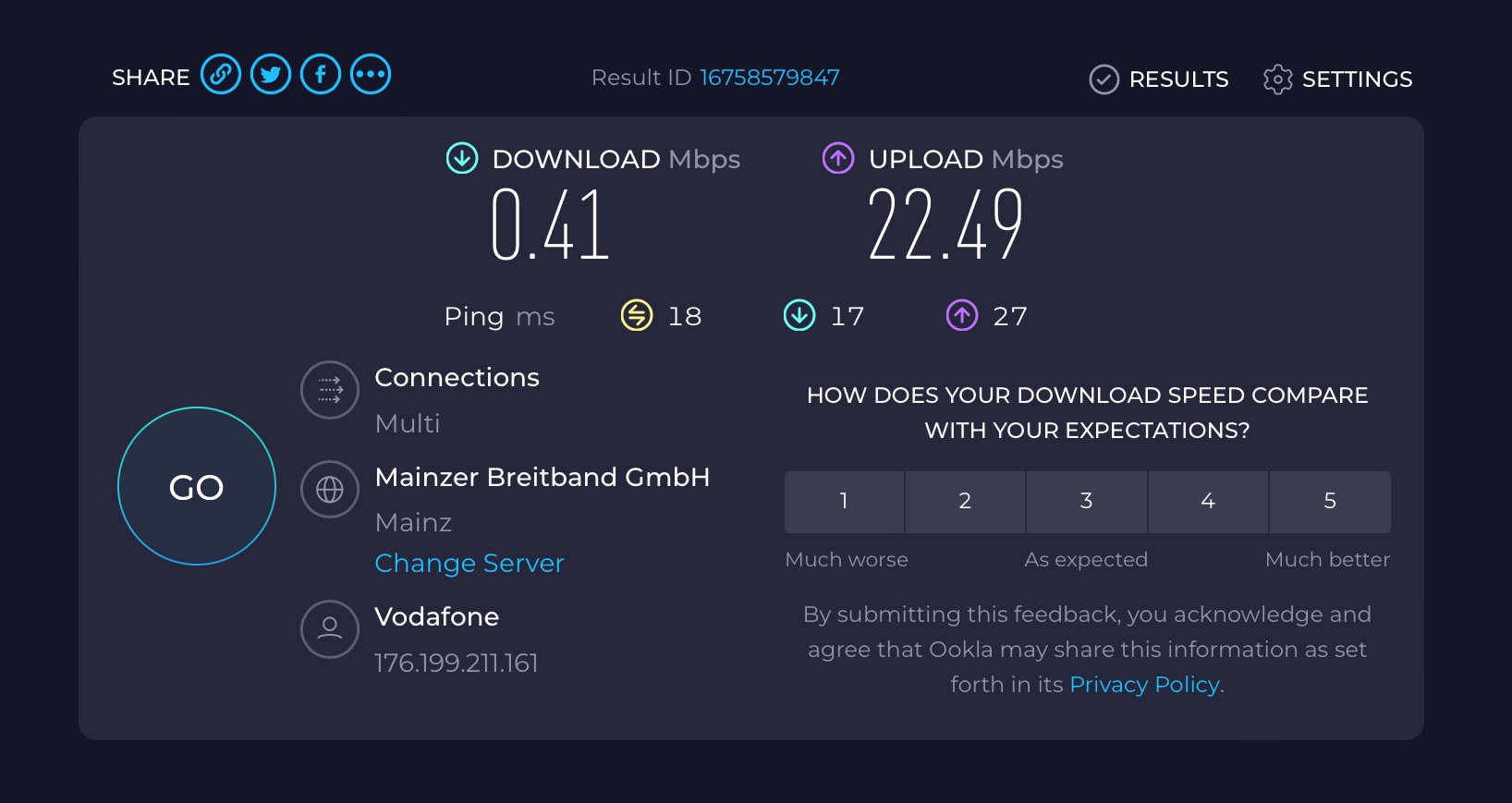 Über WLAN erreichte ich einen Download von 1-2 MBits und einen Upload von den vollen 50 MBits. Die gleichen Ergebnisse erreichte ich mit meinen Computer, der über ein LAN Kabel direkt mit der FRITZ!Box verbunden ist. Die Speedtests wurden über verschiedene Websiten durchgeführt, aber hatten immer das gleiche Ergebnis.