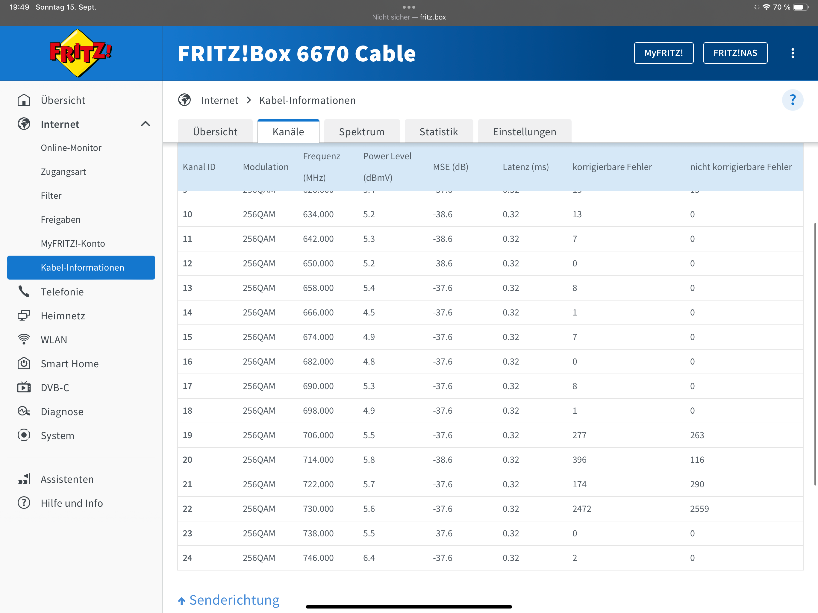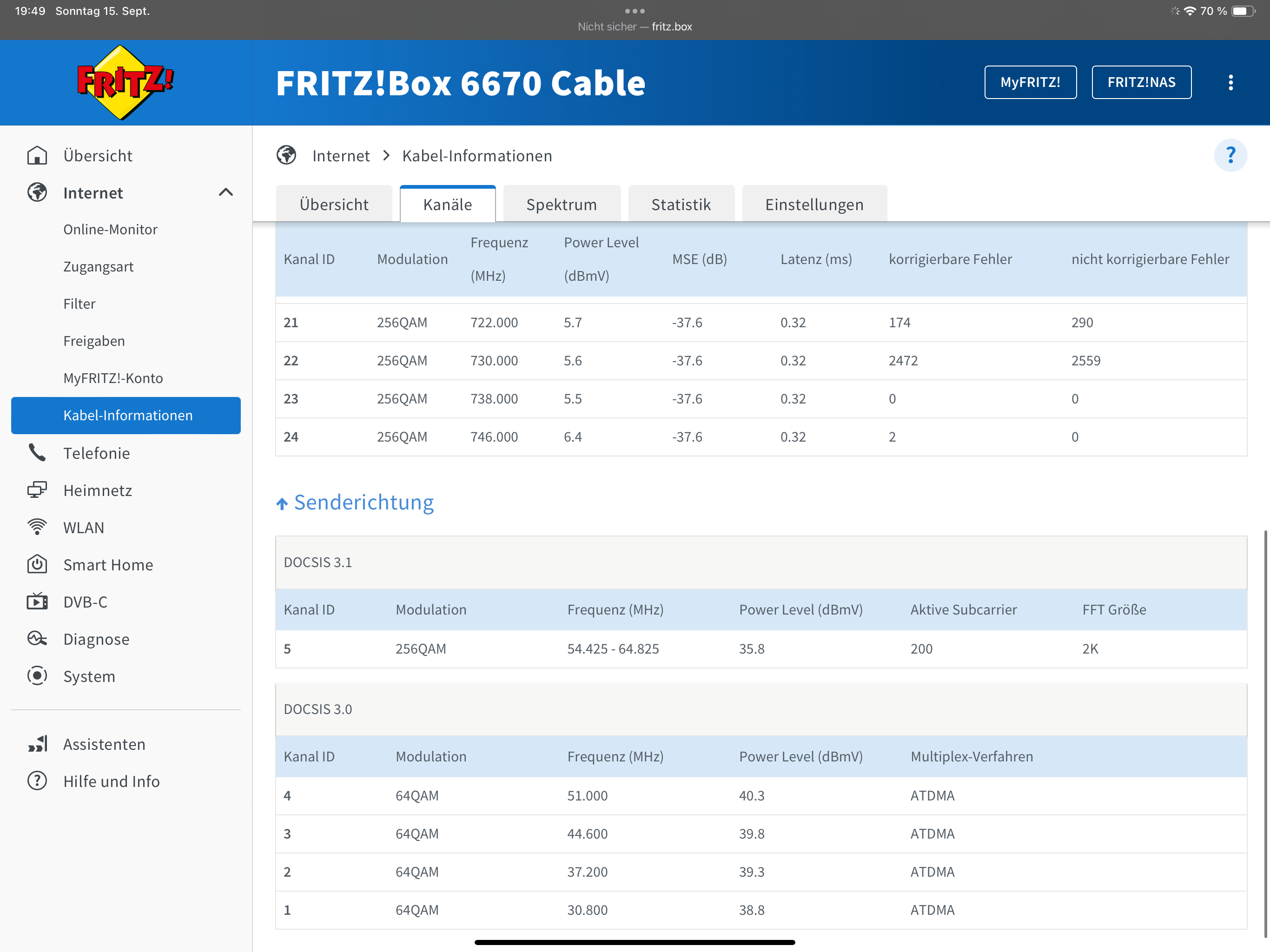 Das neu starten und komplette resetten der FRITZ!Box half auch nicht. Aus diesem Grund kam ein Vodafone Techniker zu mir nach Hause, der den Verteilerkasten unten im Haus und meine Kabeldose prüfte. Nach ein weniger schrauben und drehen sagte er, dass es nun klappen sollte. Dies stimme auch. Kurz nachdem er ging trat der Fehler aber erneut auf und der Download war wieder im Keller. Ein weiterer Techniker kam vier Tage später und brachte mir eine neue FRITZ!Box. Mit dieser funktionierte es aber leider auch nicht und das Problem war immer noch vorhanden.