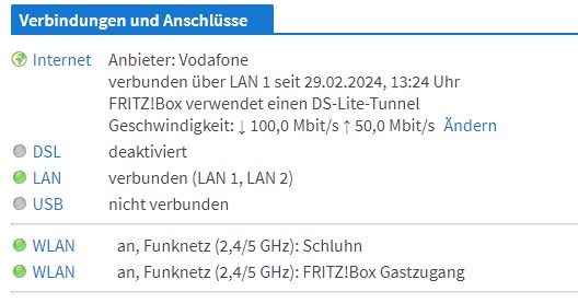 - einen frischen Speedtest mit nur deinem PC/ Laptop an der FB angeschlossen (am besten über die Windows-App von https://breitbandmessung.de/)