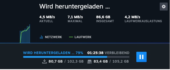 Downloadspeed Steam: 4,5 Mbits/s - 7 Mbits/s