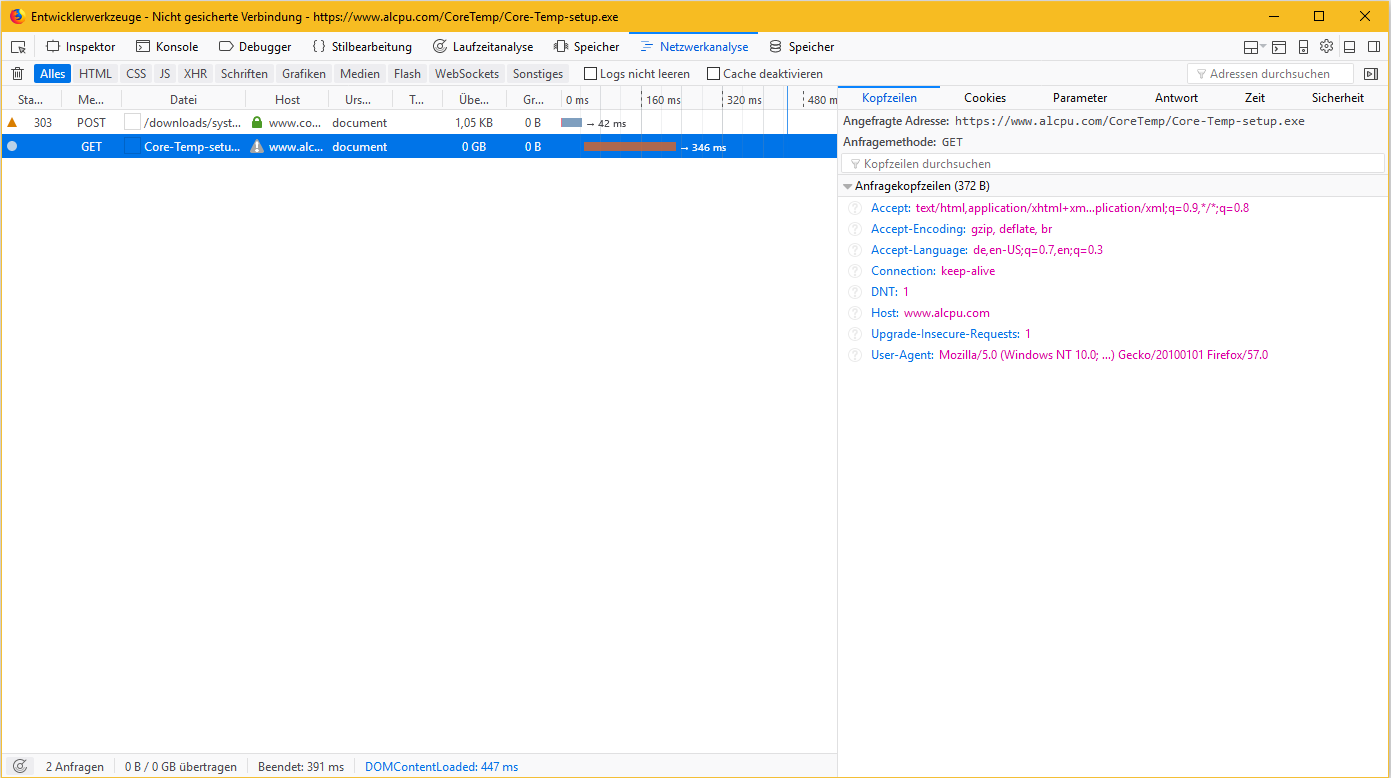 Firefox hingegen ändert eigenmächtig auf https:// und versucht https://www.alcpu.com/CoreTemp/Core-Temp-setup.exe abzurufen, was fehlschlägt.