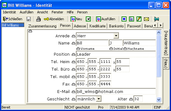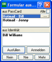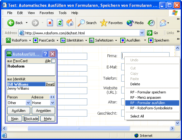 In einer Identcard werden Standarddaten wie Name, Adresse oder Email-Adresse gespeichert. Besucht man eine Webseite, auf der man diese Daten eingeben kann füllt AI Roboform die Felder automatisch aus. Lediglich den "OK"-Button muss man noch anklicken.