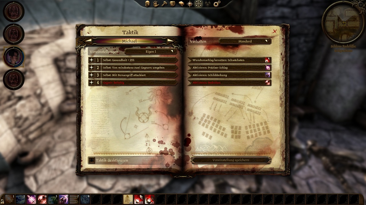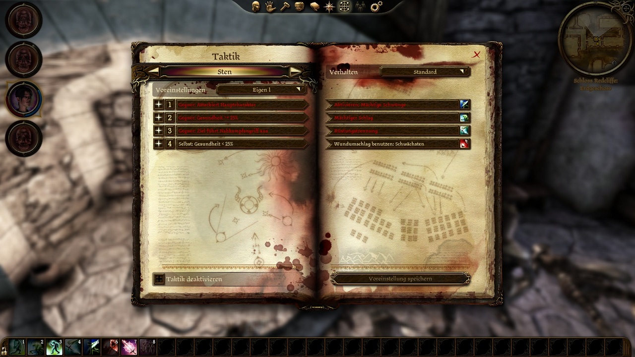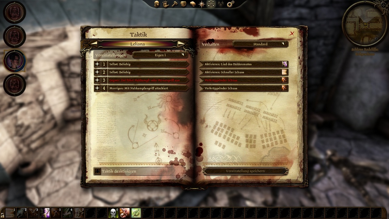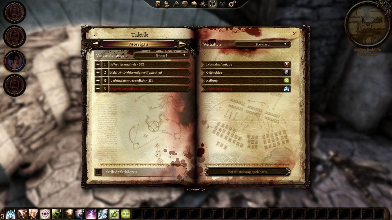 Wenn dein Charakter nicht heilen soll, weil du einfach keinen Bock drauf hast, ist das ok. Pack einfach Morgaine mit in die Gruppe und teile ihr entsprechende Aktionen zu, wie z. B. "Wenn Verbündeter unter 50% HP, dann wirke Heil-Zauber". Ich habe es immer so gehandhabt, dass ich mit meinem Charakter getankt habe und die anderen 3 Chars so gut wie gar nicht gesteuert habe. Das ging halt alles von selbst, über die entsprechend zugeordneten Aktionen. Und ich finde, dass darin auch das gesamte Geheimnis liegt. Richtig eingestellt wirkt es Wunder!