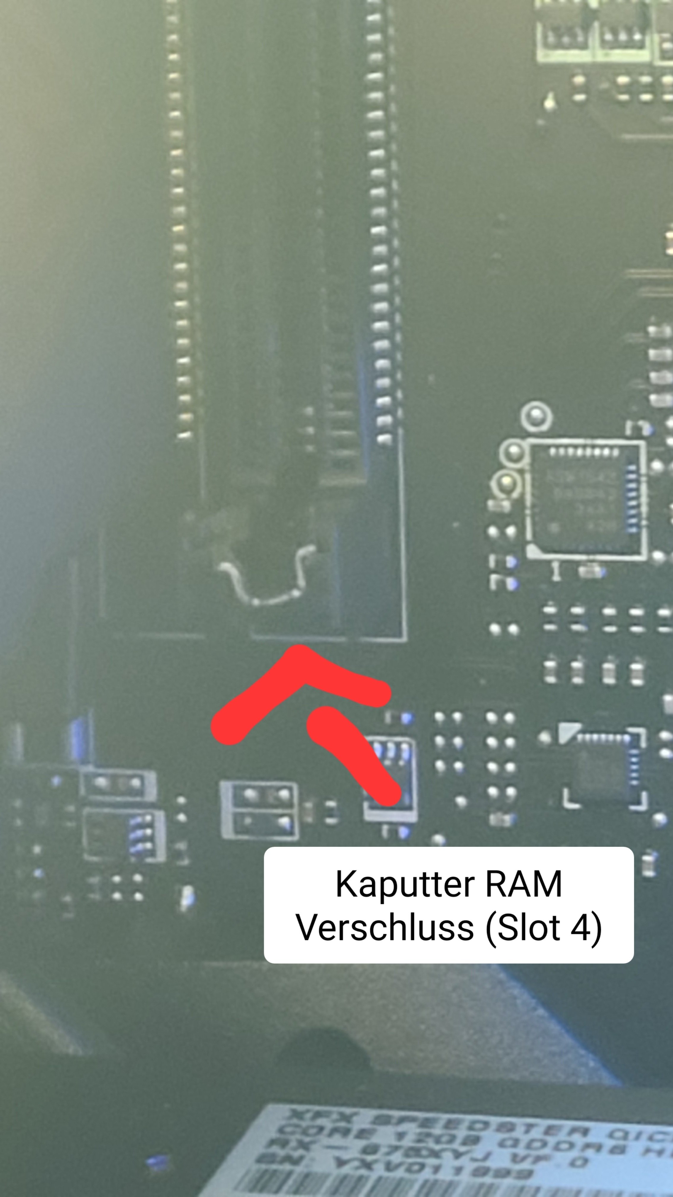 Hallo Zusammen, ich habe gestern zum ersten mal selbst einen PC gebaut. Wollte dann booten. Alle Lüfter drehen sich und sind beleuchtet, jedoch leutet auf dem Mainboard die LED CPU rot und die LED DRAM gelb/orange. Die anderen beiden namens BOOT und VGA leuchten gar nicht. Ich konnte mir schon denken woran es liegt, unzwar sind mir gestern beim einbauen des RAMs auf dem 4. Slot an den Seiten die Verschlüsse abgebrochen. Habe zum ersten Mal einen PC gebaut und mich deswegen gewündert, dass ich so doll drücken muss. Also bin ich davon ausgegangen, dass der RAM Slot defekt ist, (was in meinen Augen eigentlich nicht sein kann, da lediglich an den Seiten der Verschluss fehlt) und habe den RAM in Slot 1 und 3 gesteckt. Booten tut der PC immer noch nicht und die Leuchten leuchten beide immer noch.
