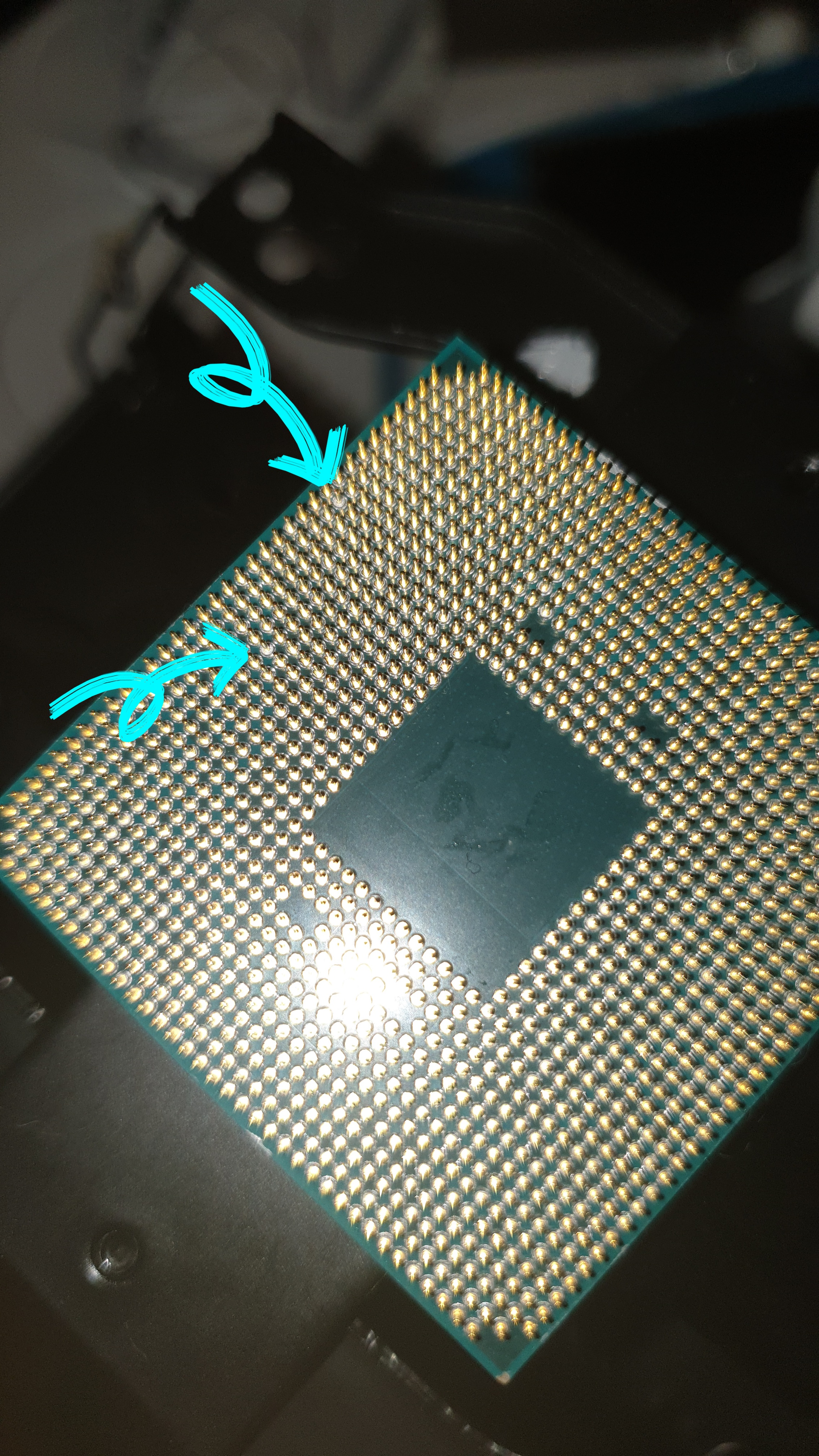 Bei dem Bild fallen mir 2 Pins ins Auge die nicht aussehen wie die anderen. CPU kaputt?