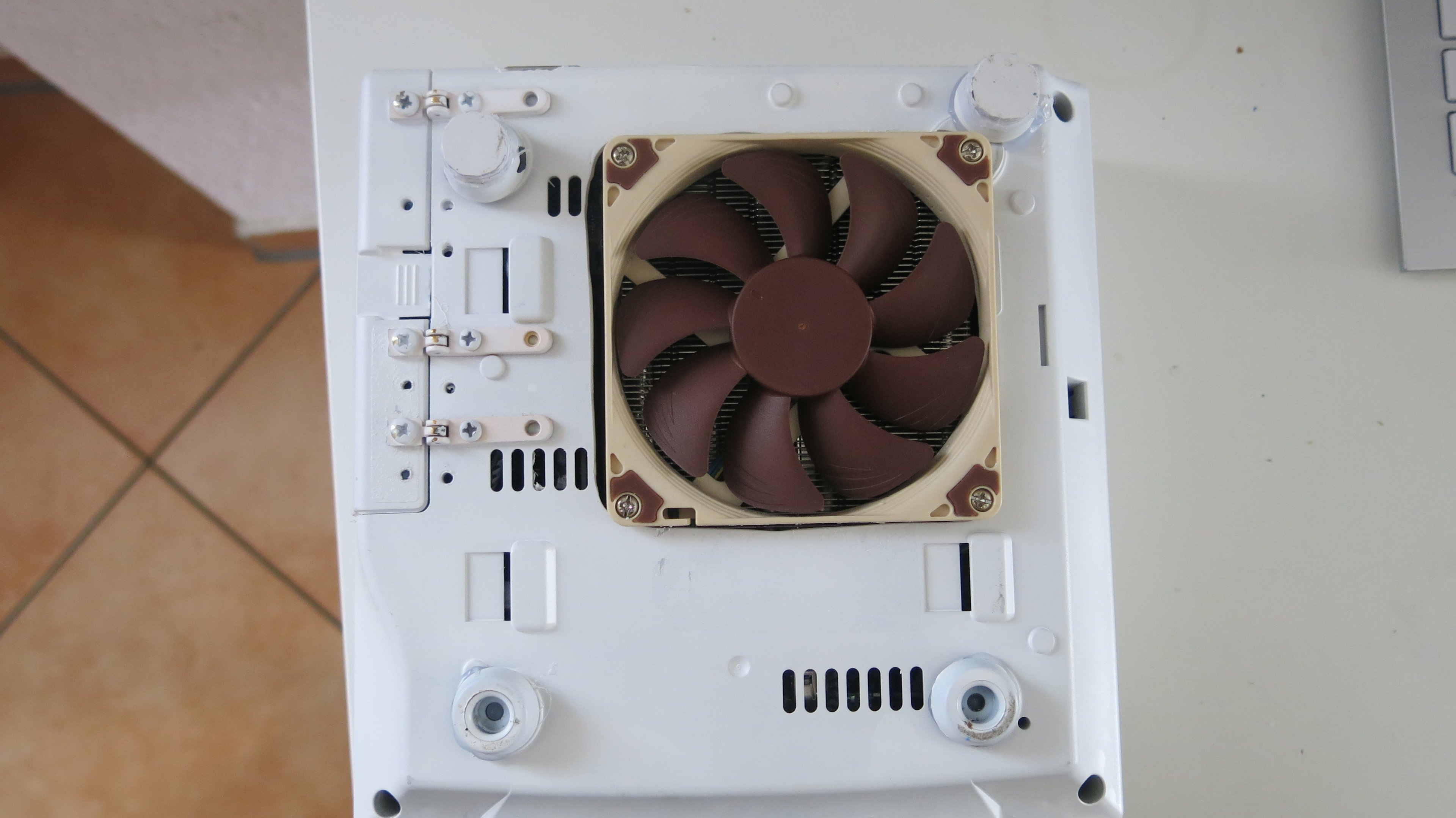 Ich wollte Keine so hohen Füße anbringen, weil es ziemlich doof aussehen würde. Stattdessen habe ich nur die hinteren Füße höher gestellt. Luftzufuhr ist so völlig ausreichend. Diese Aufgabe erfüllt ein Noctua NH-L9a-AM4.