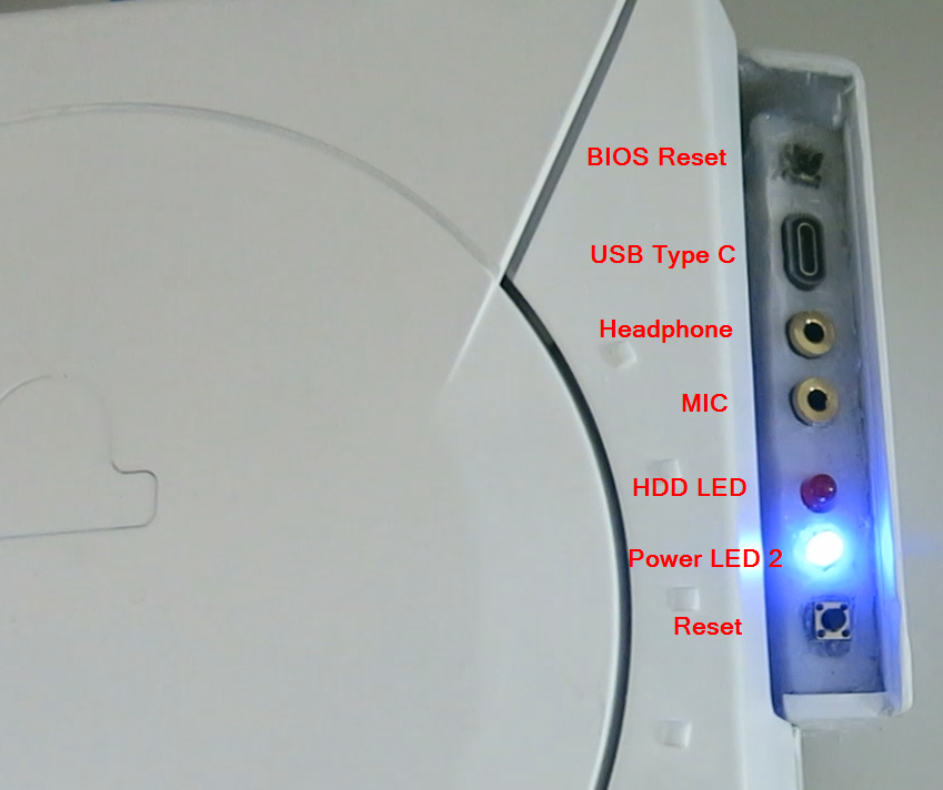 Die Unterseite der Dreamcast. Die forderen zwei Füße stehen niedriger als die hinteren zwei. Ich musste die hinteren beiden erhöhen, weil die APU unter Vollast gerne über 85 °C heiß wurde. Nach der Maßnahme Teillast 55 °C und Vollast ca. 80°C, kommt auf die Umgebungstemperatur an. Der Fuß oben Rechs musste versetzt werden, weil der Lüfter vom Kühler so viel Platz weg nimmt.
