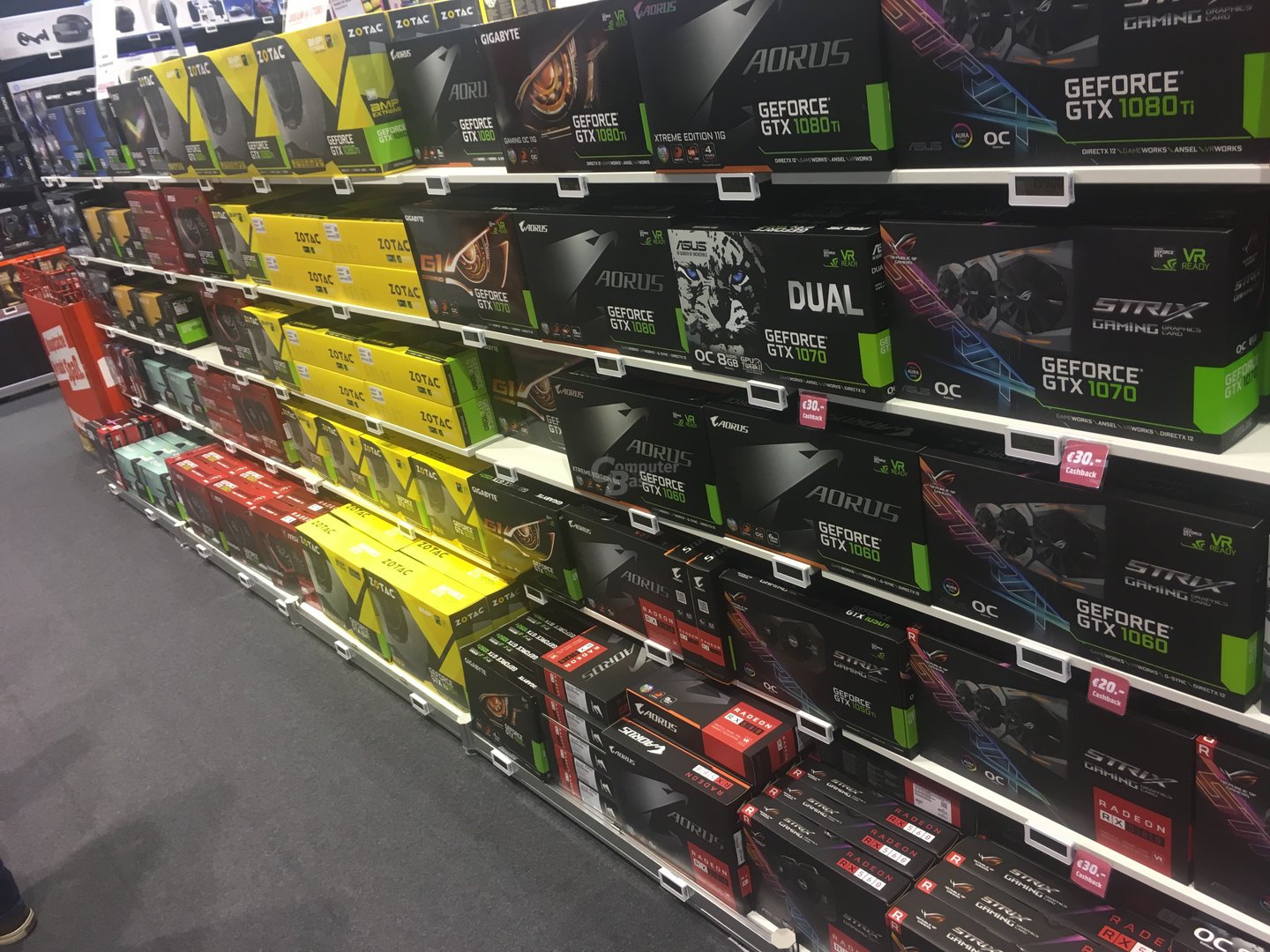 Das provisorische Ladengeschäft bietet neben den im Katalog beworbenen Grafikkarten noch weitere Modelle, darunter die Asus GeForce GTX 1080 Ti Strix (799 Euro), die MSI GeForce GTX 1080 Ti Trio (829 Euro) oder die MSI GeForce GTX 1080 Gaming X (569 Euro).