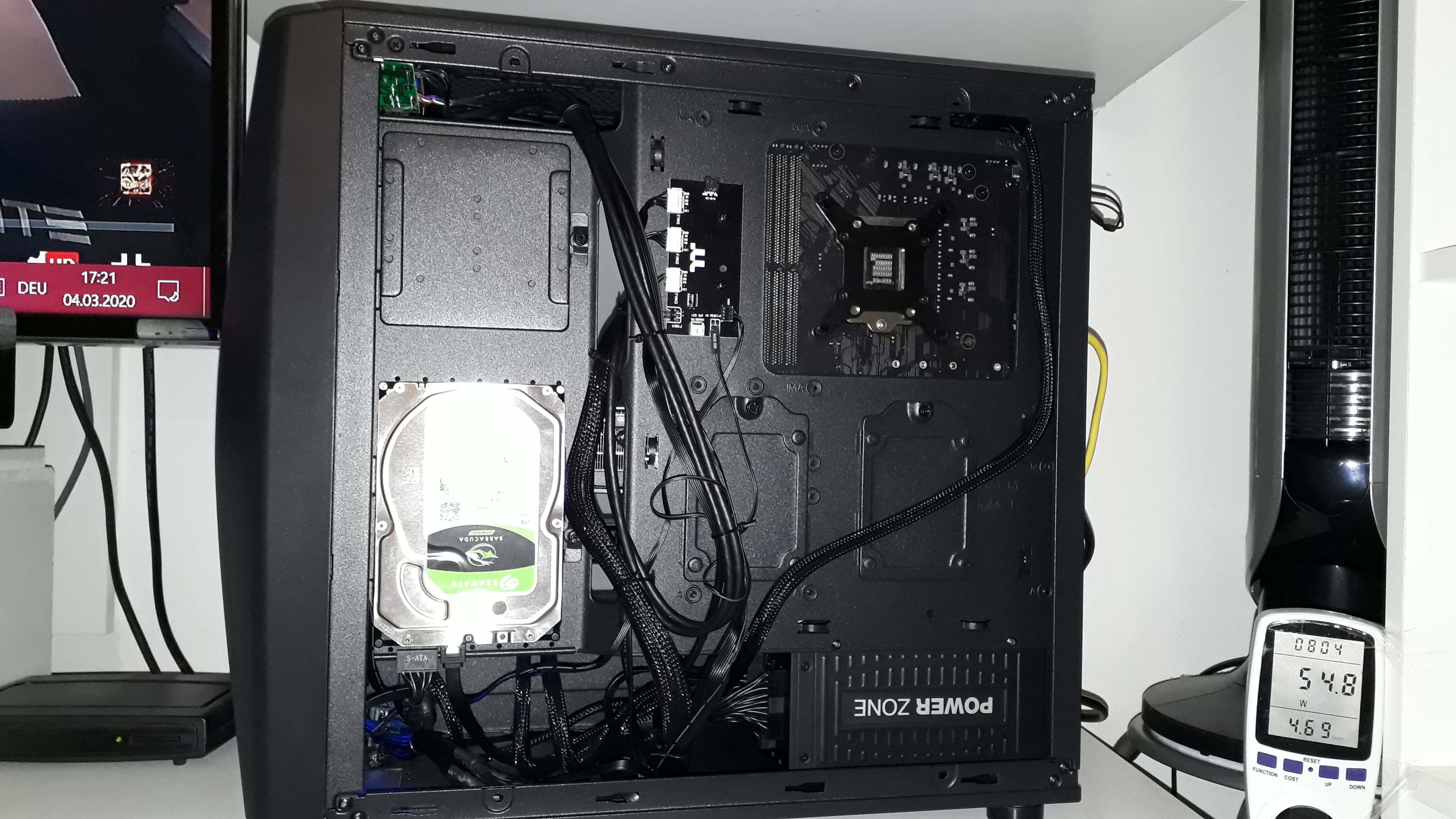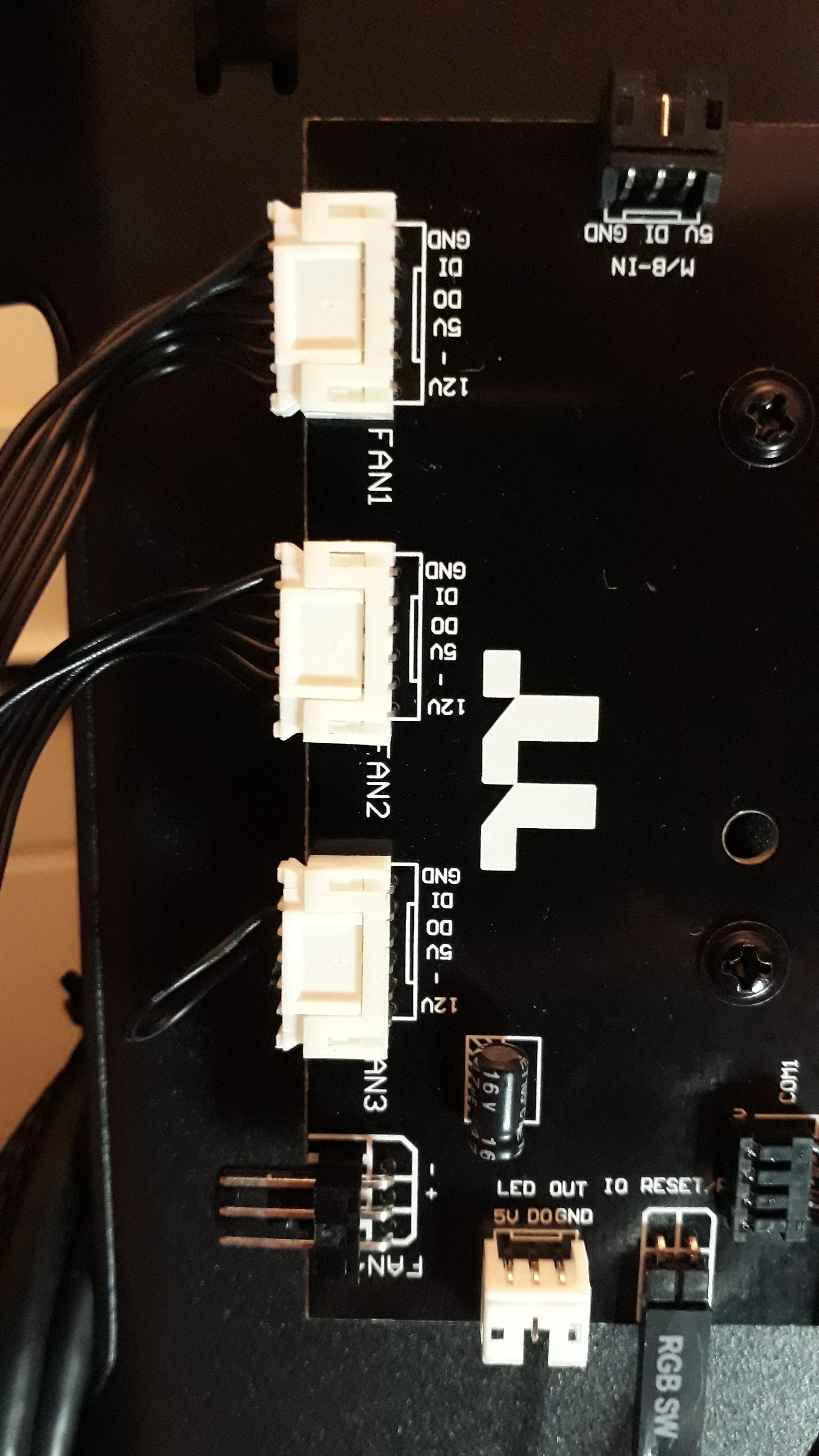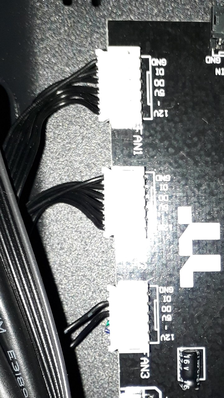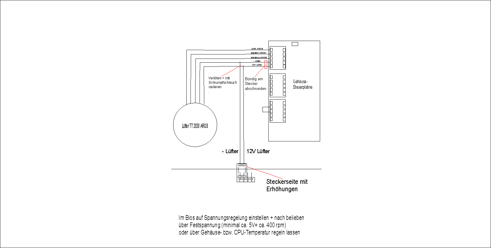 Unten ein Vorschlag zur Drehzahlsteuerung der 20cm-Gehäuselüfter 2030, die Thermaltake z.B. in den "Commander C31-C36" verbaut. Da diese mit einem 5-poligen Anschlussstecker an der mitgelieferten ARGB-Steuerung angeschlossen sind, kann man sie nicht auf einfache Weise drehzahlregeln. Die beiden hochwertig gelagerten 200mm ARGB Lüfter habe ich mit zwei Anschlusskabeln von alten Lüftern umgerüstet auf Mainboard-Spannungssteuerung. Anbei die Skizze der Schaltung, vielleicht kann die jemand mit einem Thermaltake ARGB-Gehäuse gebrauchen. Ob dabei Lüfterkabel mit zwei, drei oder vier Anschlüssen am Stecker verwendet werden spielt keine Rolle, der Anschluss bleibt gleich. Beide Lüfter würde ich nicht doppelt an einem geregelten Mainboardanschluss betreiben, die Leistung ist grenzwertig. Also besser zwei separate Anschlüsse belegen.