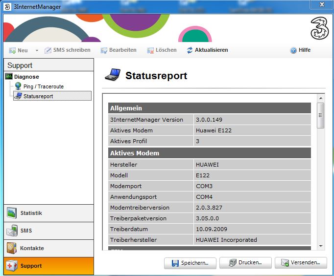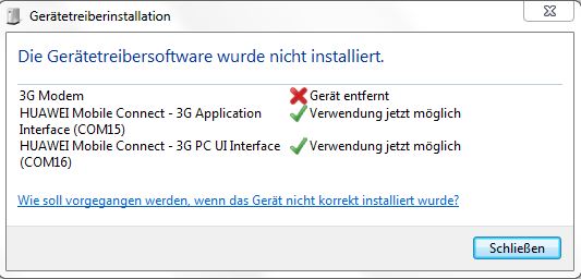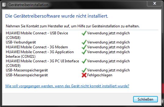 Das Problem ist Folgendes: Steckt man den Huawei Stick an, gibts das Plopp Geräusch, aber bald das andere Plopp Geräusch, als ob man nen USB Stick gerade absteckt. Die LED am Stick blinkt 2x hintereinander kurz Grün, dazwischen 3 sec pause, wieder doppelt kurz Grün. Andauernd gibts aber NUR das Geräusch, des "USB Stick Aussteckens". In Endlosschleife. Im 3D Data manager wird das Modem natürlich nicht gefunden, kann es kann daher auch nicht versucht werden, eine Intenetverbindung herzustellen.