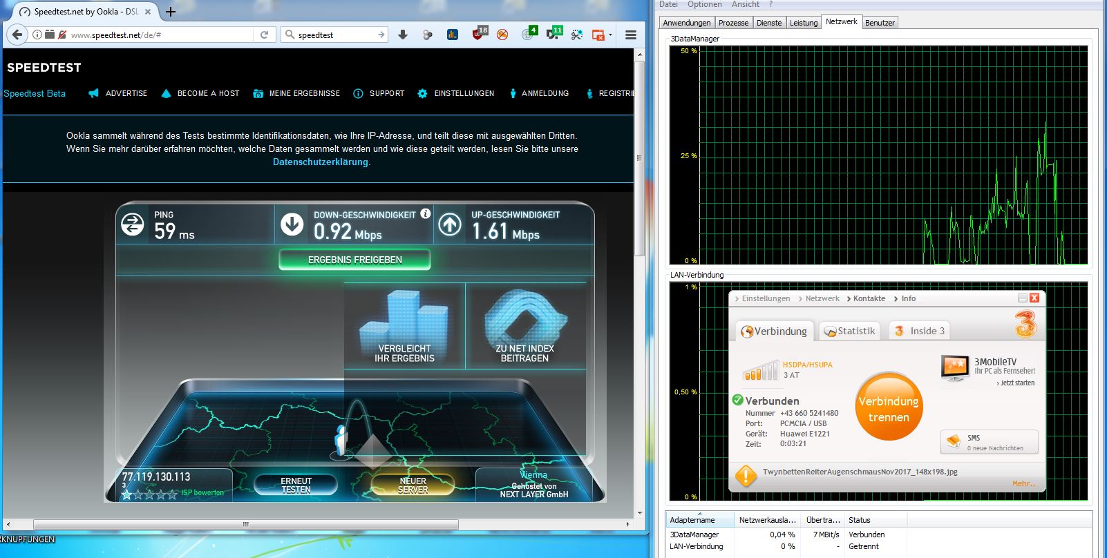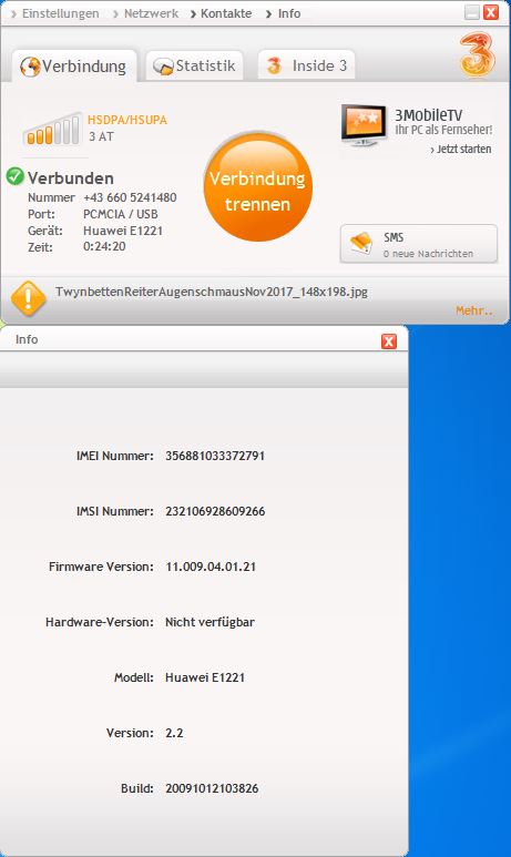 Man klickt am Desktop doppelt auf das icon vom "3 Data Manager", gibt den 4stelligen pin ein, und der Stick verbindet sich. Der Speed ist unter aller Kanone, aber mein Rat, statt dieser unbedienbar langsamen Notlösung sich "gscheites" Internet zuzulegen, wird mit der Aussage "mir reicht des schon" abgewimmelt. Nun gut.