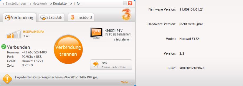 Vorgestern Anruf, ihr Internet geht nicht, der Stick lässt sich ned verbinden. Sie hat für ihr Smartphone (huawei P8 Lite, oder P7 Lite?) die HiSuite installiert, damit sie ihre Fotos vom Smartphone auf den Lappi backuppen kann. Seit dem geht das Internet nicht mehr.
