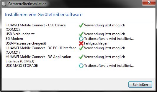 Stick angesteckt, rechts unten Fenster mit ein paar huawei Einträgen, dass was installiert wird (ein paar Sekunden KEIN "USB Absteck Ton", dann jedoch wieder der usb auswerf ton und irgendwo ein rotes X bei den ganzen Einträge, danach wieter mit dem regelmäßigen USB auswurfsignal.