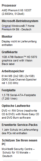 Also ich finde das Angebot genial. Mit einem Gutschein komme ich mit 6x2,6GHz 6GB Ram HD5870 auf nur 902€, da ist man teurer dabei, wenn man den selber zusammenstellen möchte, vor allem, da hier noch ein OS dabei ist.