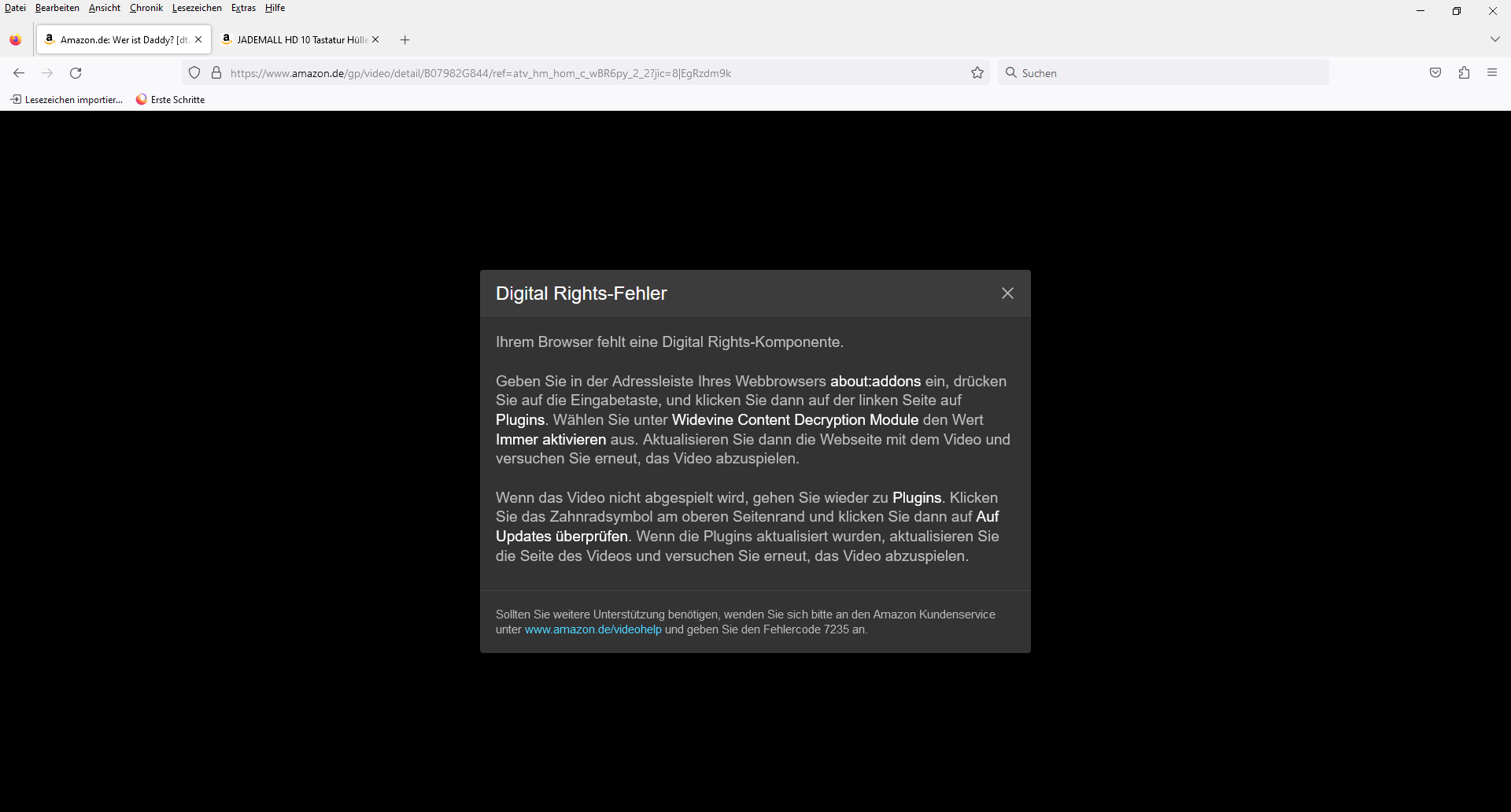 Die Fehlermeldung (7235) bei Amazon lautet: (vgl. .png-Dateianhang)
