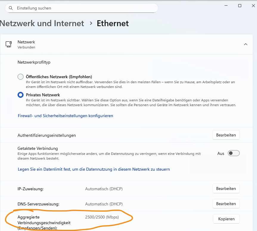 Momentan ist der PC deshalb per WLAN im Netz (hier kommen ~200MBit an, bei einer 250er Leitung). Das ist aber OK, da 3 stöckiges Haus + 2 Mesh Repeater im Einsatz. Mehr geht bei den anderen Geräten auch nicht. Würde aber dennoch lieber per LAN ins Netz, da es einfach weniger störanfällig ist.