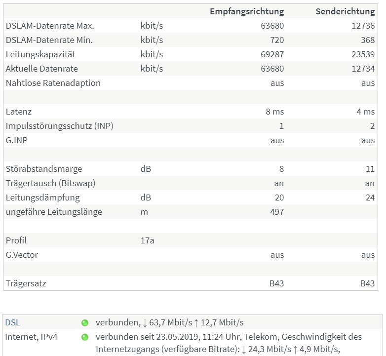 DSL Sync lt. Fritzbox: 63,7 / 12,7 (siehe Anlage)