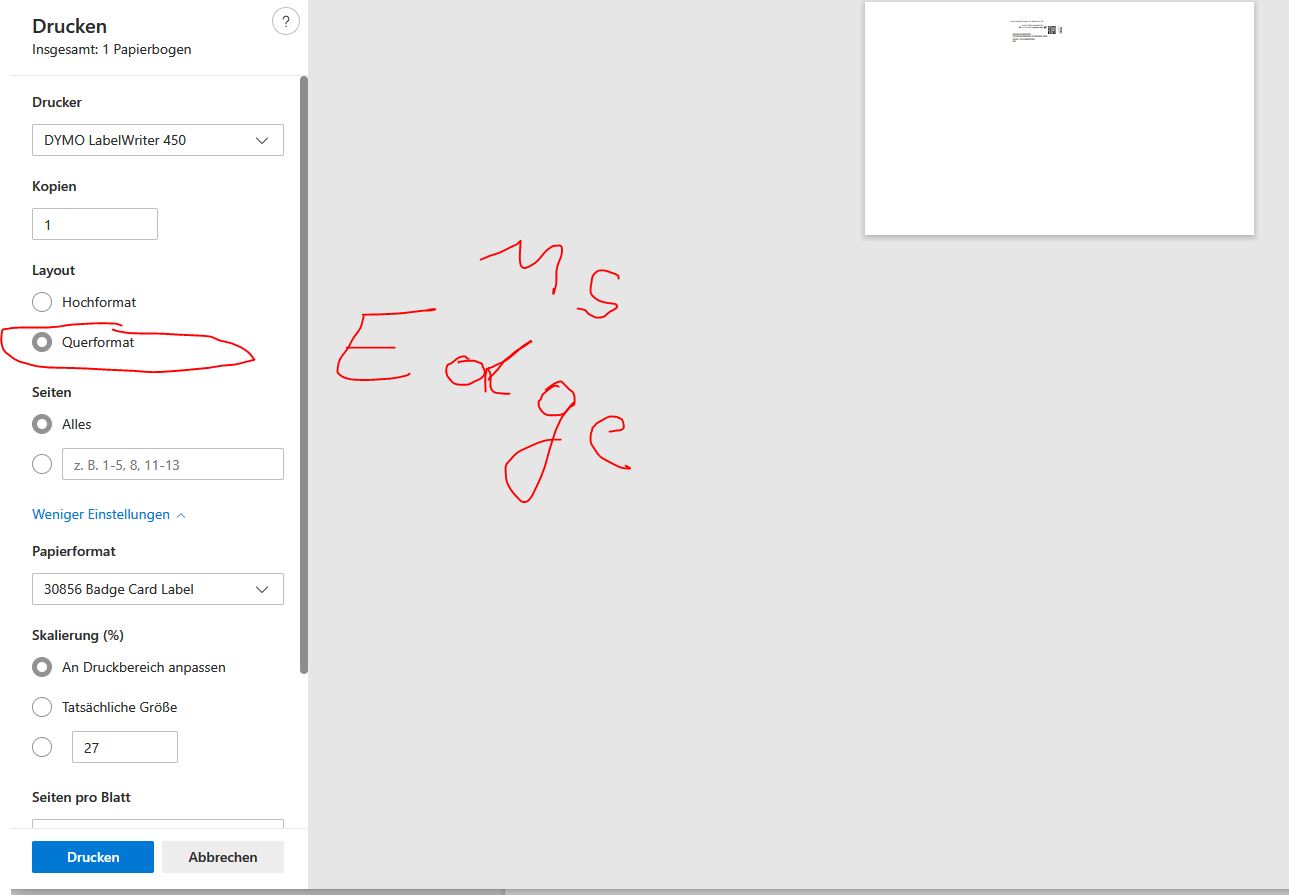 Wenn ich das gleiche über den Edge Browser mache, dann kann ich wenigstens das "Layout" Querformat auswählen.