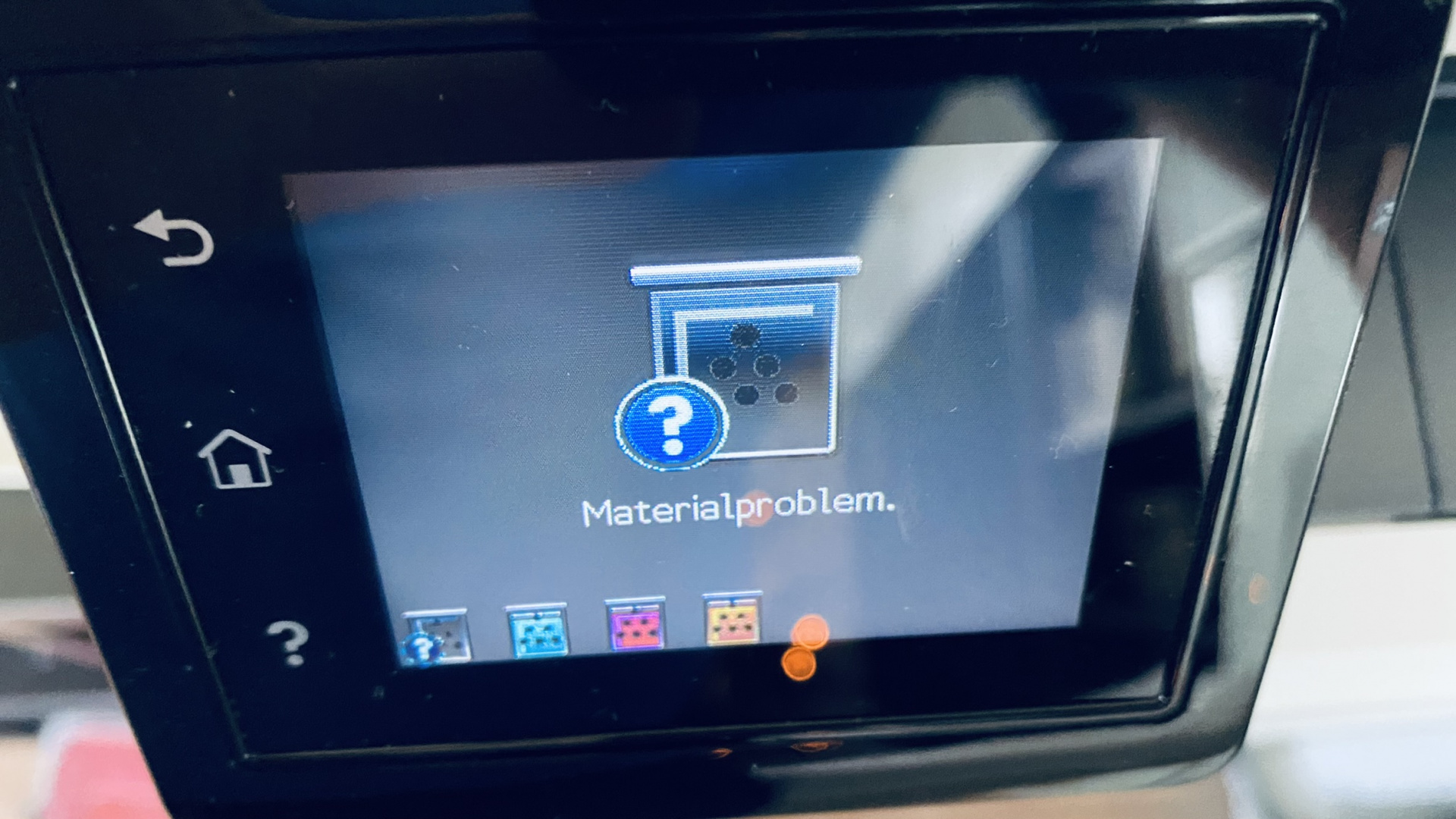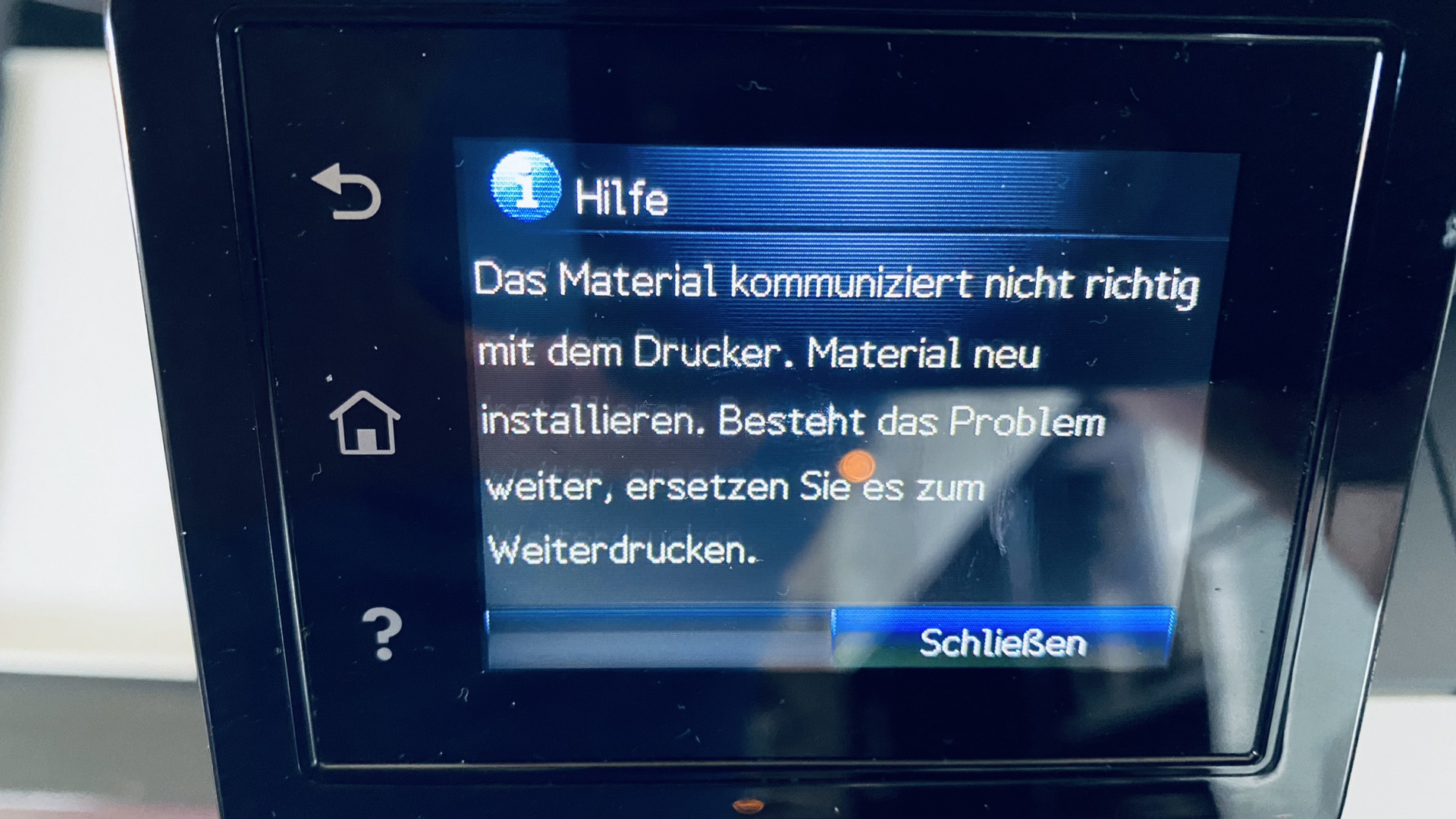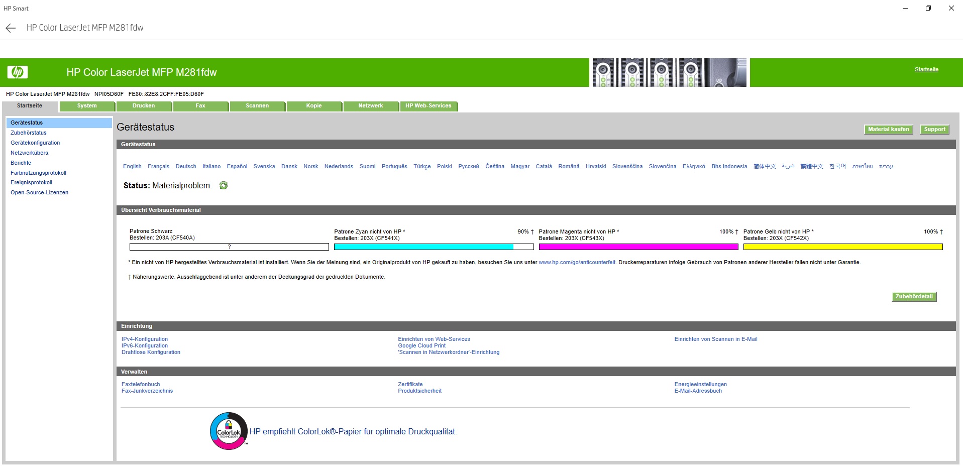 Nachdem alles wieder zusammengesetz ist, kommt immer die Meldung: "Materialproblem" . Allerdings ist das Fragezeichensymbol nur auf dem schwarzen Toner. Die anderen werden ordnungsgemäß erkannt. Danach die Meldung, dass das Material nicht richtig mit dem Drucker kommunizert.