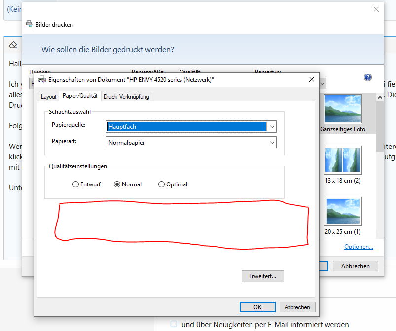 Wenn ich ein Bild im Explorer mit doppelklick öffne, dann Rechtsklick auf das Bild und "Drucken" auswähle, auf "Weitere Einstellungen klicke" und dort unter den "Ausgabe Optionen" dann "Farbe" auswähle kommt die Fehlermeldung: ,,Farbe'' wurde aufgrund eines Konflikts mit einer anderen Druckeinstellung geändert.
