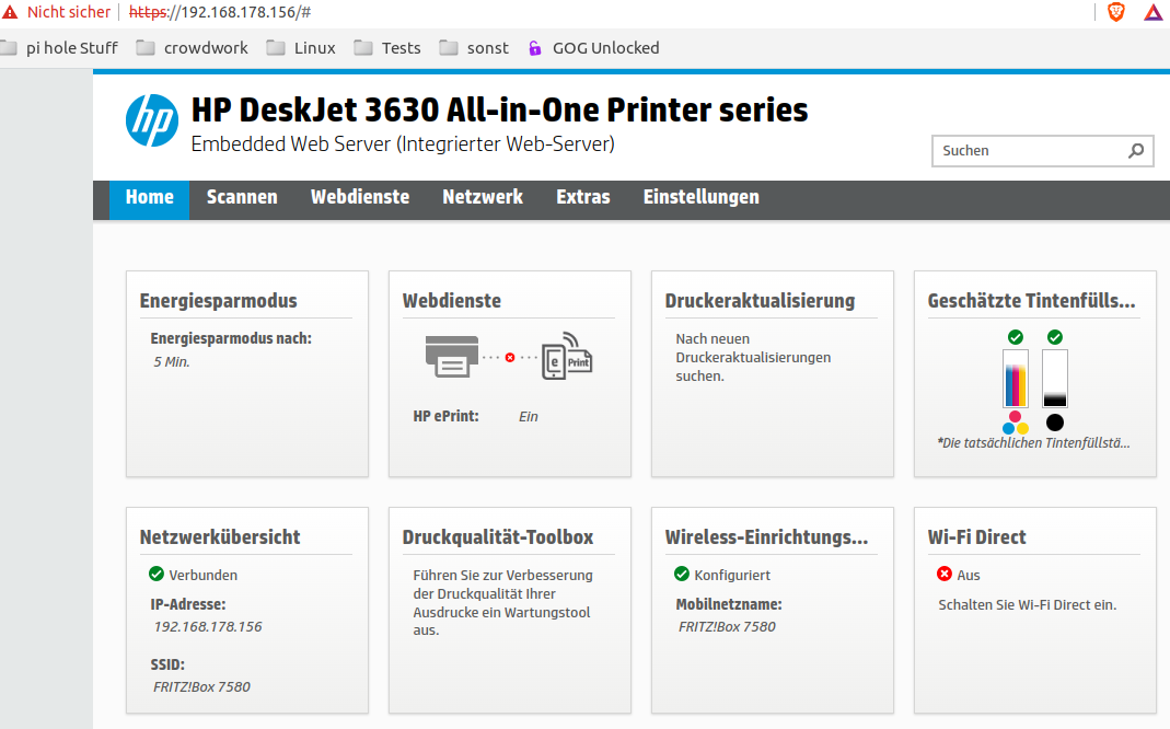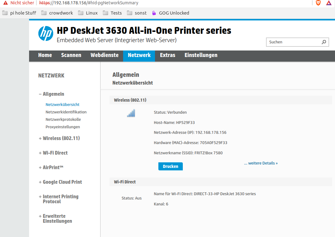 Der Drucker ist über WLAN mit meinem Netzwerk verbunden. Als Router nutze ich eine FritzBox 7580 - der Drucker geht aber über einen Fritz Repeater 300E ins WLAN - genau wie der PC mit dem ich das hier schreibe.