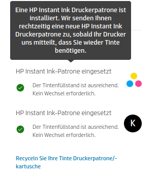 Sobald die Tinte zur Neige geht bekomme ich automatisch neue. Die Tintenlieferungen sind im monatlichen Preis enthalten. Dieser ist abhängig von der gewählten monatlichen Druckseitenzahl (Abomodell). Nun habe ich erst gemerkt, als meine Tinte leer war, dass der Drucker keine Internetverbindung mehr hat.