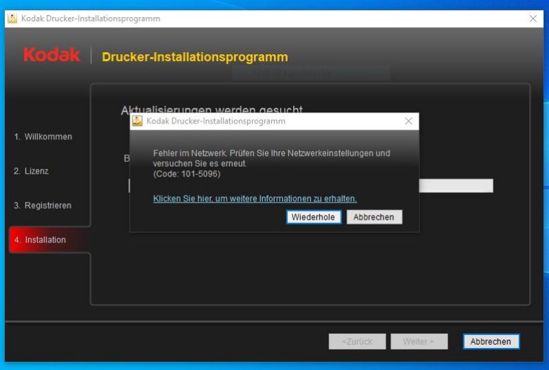 Wuerde wie @mr.malcom vermuten dass das Problem der Installer ist. Wahrscheinlich ist die gesuchte Seite mit den Updates nicht mehr aktiv (kein Wunder da Kodak schon laenger nicht mehr in dieser Form existiert) und dann moechte der Installer nicht mehr mitspielen (schlechtes SW Design). Falls die Holzhammermethode nicht funktioniert wird es wahrscheinlich schwierig einen anderen Treiber ohne diese Probleme zu finden.