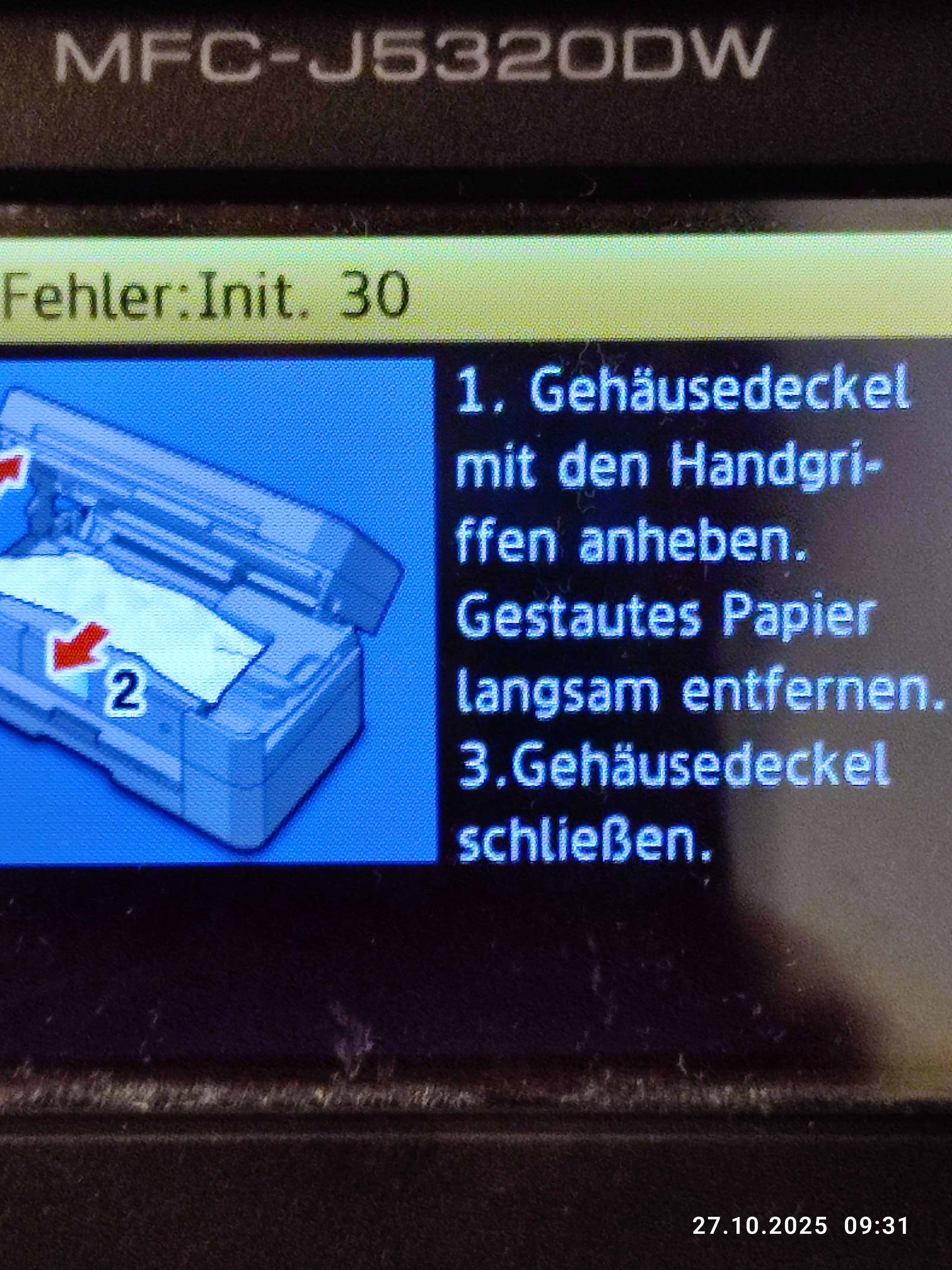 Nachdem ich den Drucker vom Strom genommen habe, habe ich jetzt die Meldung Int. 30, s. Foto. Doch es ist kein Zellstoff oder Papier zu sehen.