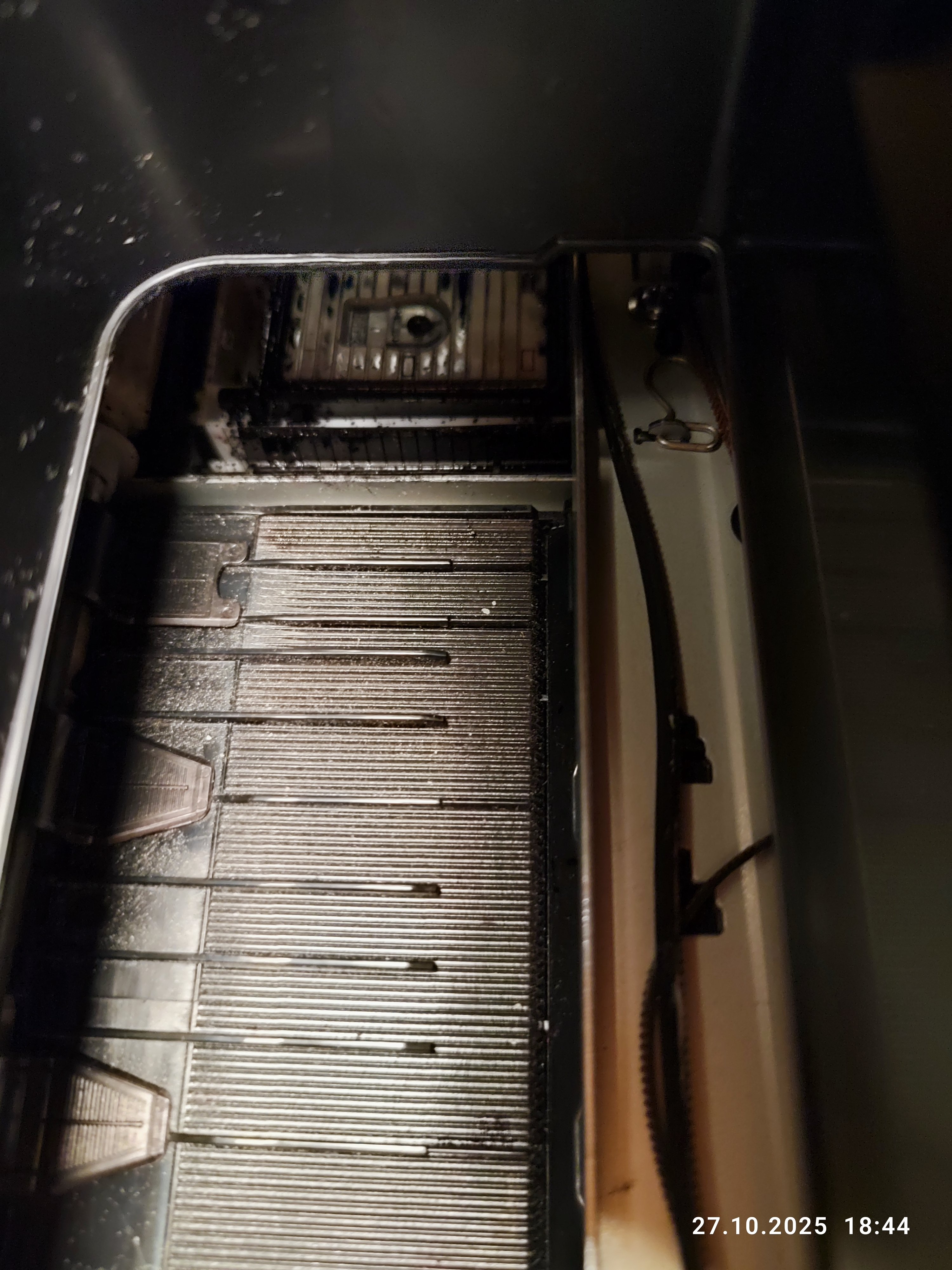 Ich habe festgestellt, dass, wenn ich die Abdeckung öffne, das viereckige Kissen ganz links voll mit schwarzer Tinte ist. Die habe ich, so gut es ging, mit Küchenpapier entfernt.