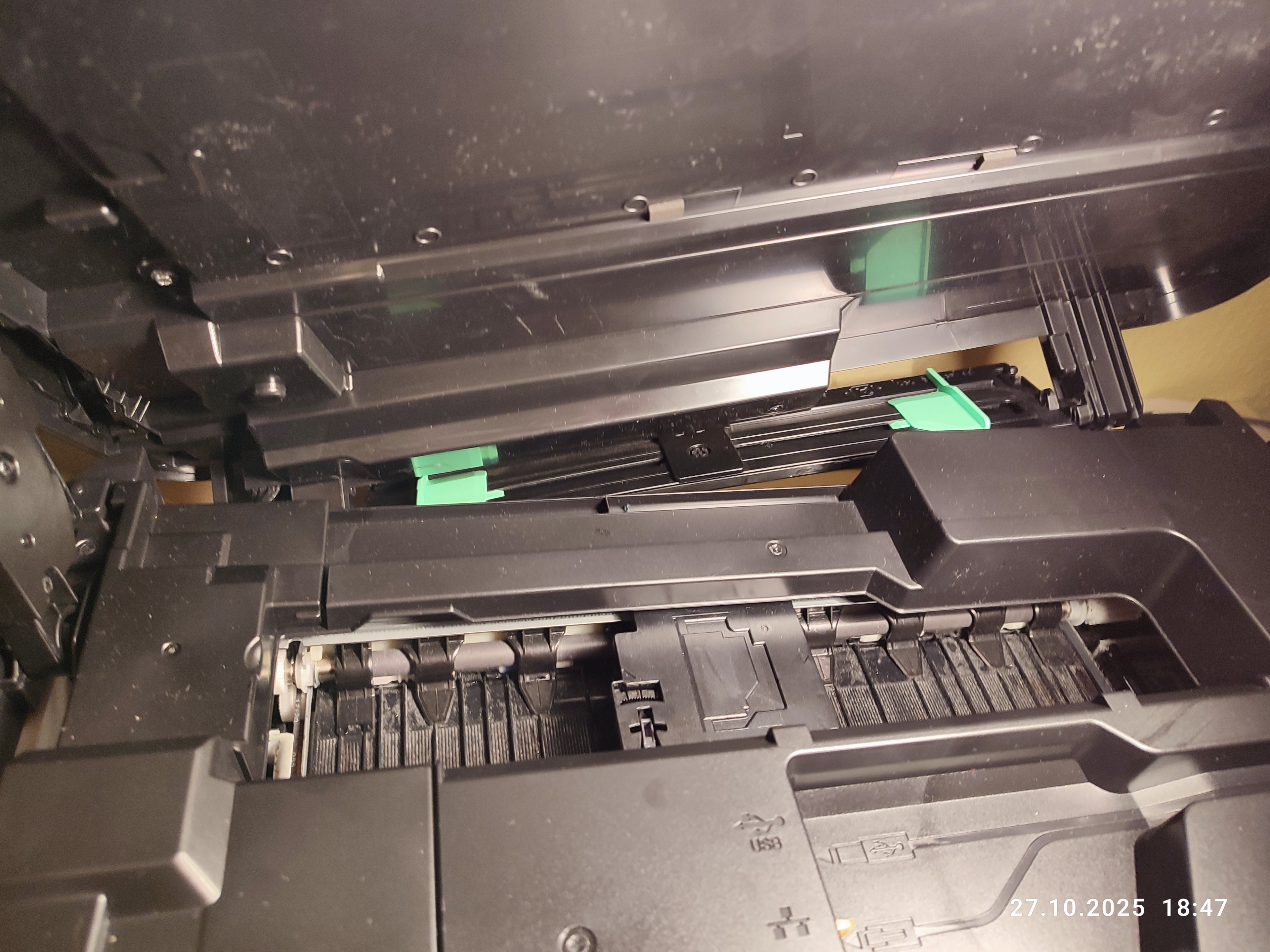 Ich hatte nach der Reinigung der schwarzen Düse auch das Papier rausgezogen, was vermutlich nicht sein sollte. Dann habe ich den Gehäusedeckel erst nach langem Hin und Her wieder zubekommen. Anschließend bekam ich die Meldung Init. 8F.