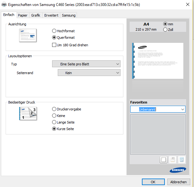 Der Drucker ignoriert dies jedoch leider und druckt einfach normal zwei einseitige Seiten nacheinander.