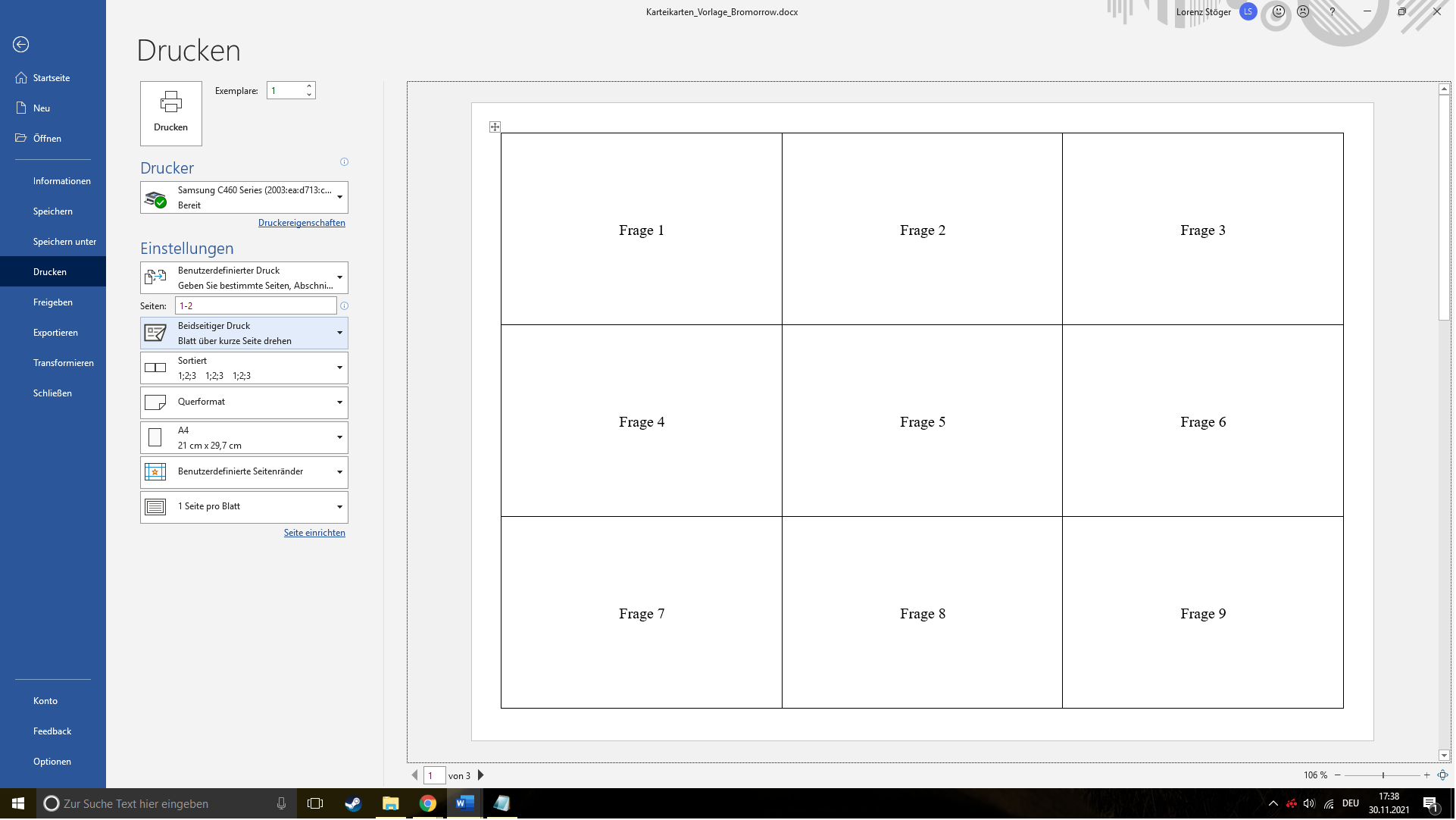 Ich habe sowohl in den Drucker-Einstellungen, sowie in MS-Word beidseitigen Druck eingestellt (siehe Screenshots).