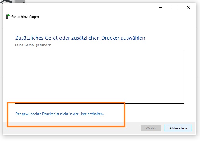 - Jetzt klicken Sie im Fenster "Drucker hinzufügen" auf "Der gesuchte Drucker ist nicht aufgeführt" und dann auf "Weiter".