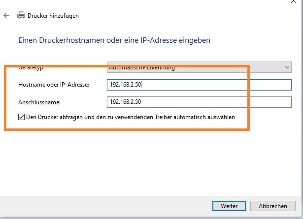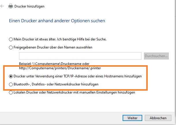 - Bitte aktivieren Sie die Option "Drucker unter Verwendung einer TCP/IP-Adresse oder eines Hostnamens hinzufügen".