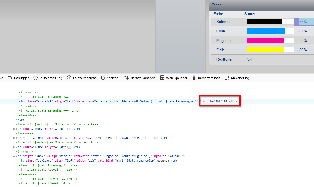 Ich hatte mir bereits die HTML Quellcode Ausgabe der Drucker Webseite angeschaut, aber die war zu nichts zu gebrauchen, aber der Tipp von calippo könnte in eine richtige Richtung gehen.