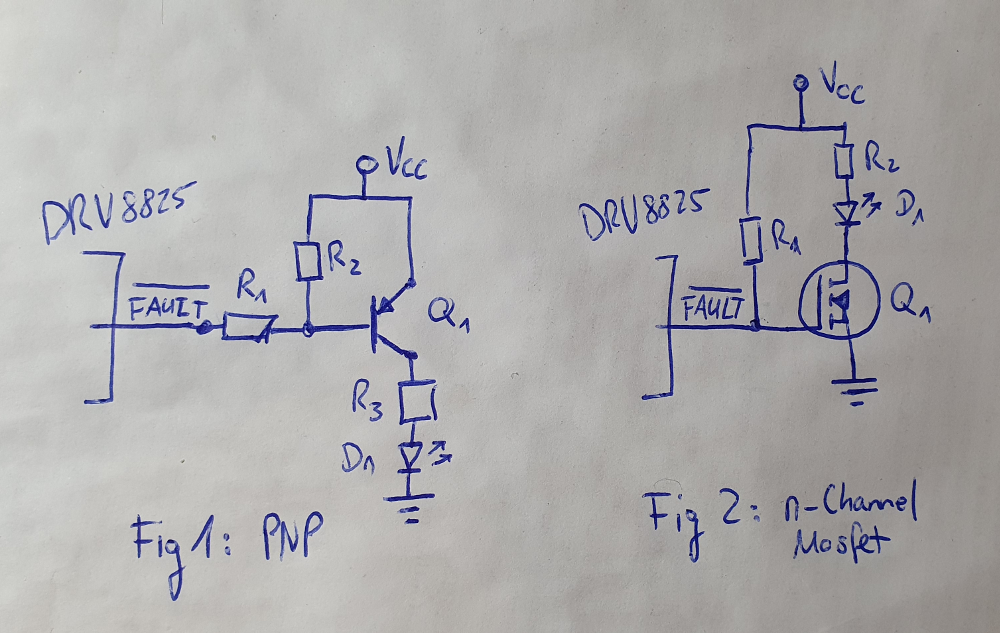 Für die grüne LED musst Du das Signal invertieren. Im Fig 2. siehst Du eine Schaltung mit einem n-Channel Mosfet. R1 lädt das Gate, der FET wird leitend, Strom fließt über R2 und D1, LED leuchtet. Bei einem Fehler zieht Fault auf Low, das Gate entlädt sich, der FET sperrt und die LED erlischt.