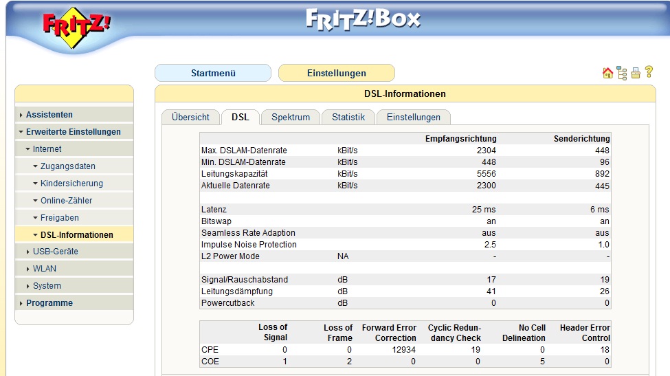 Hier mal die Werte aus der Übersicht, kenn mich zwar ned so gut aus aber das Spektrum sieht schon sehr löchrig aus und und die Werte "Forward Error Correction" aus der Übersicht und die Statistik sehn auch iwie aus meiner Sicht nich so Bombe aus: