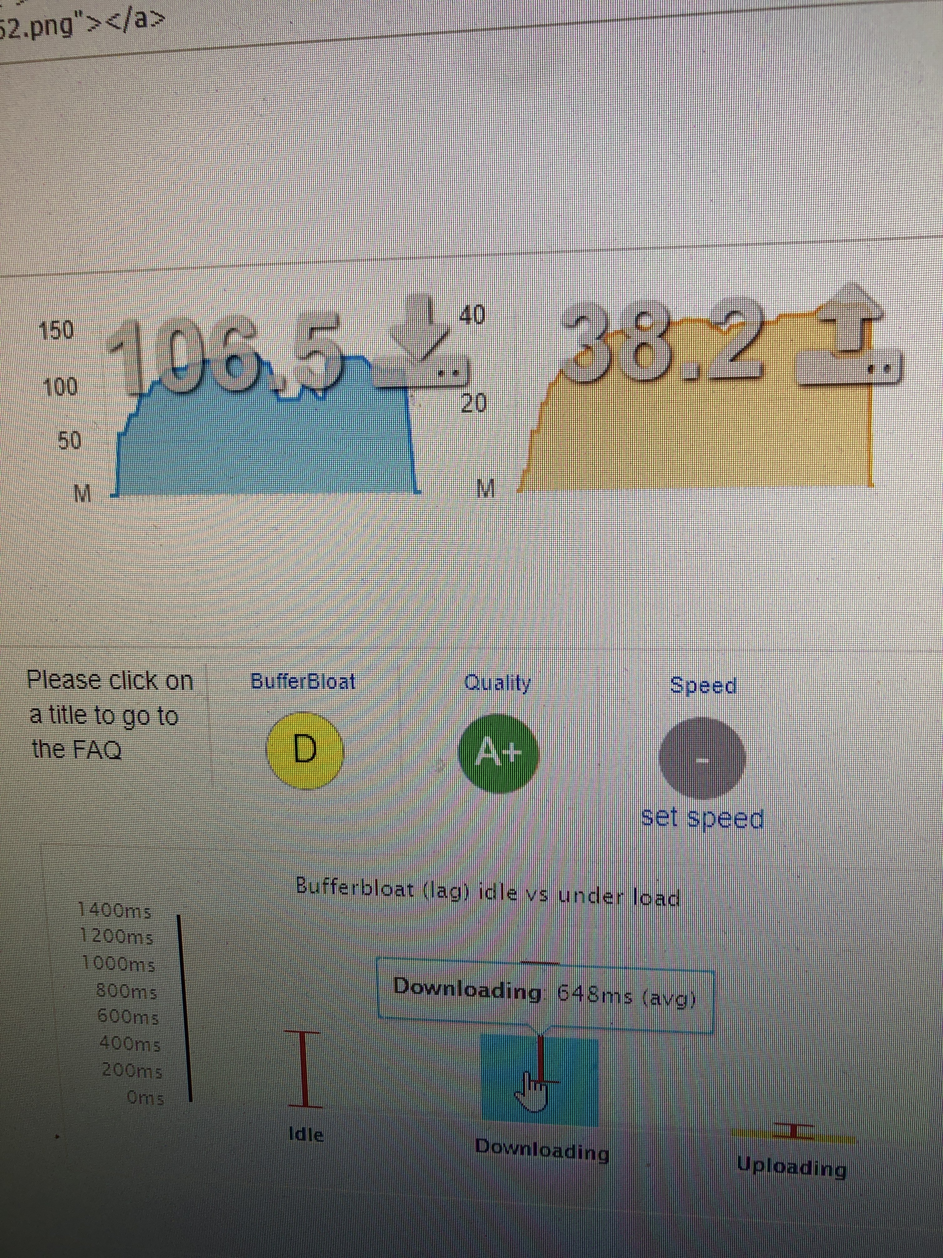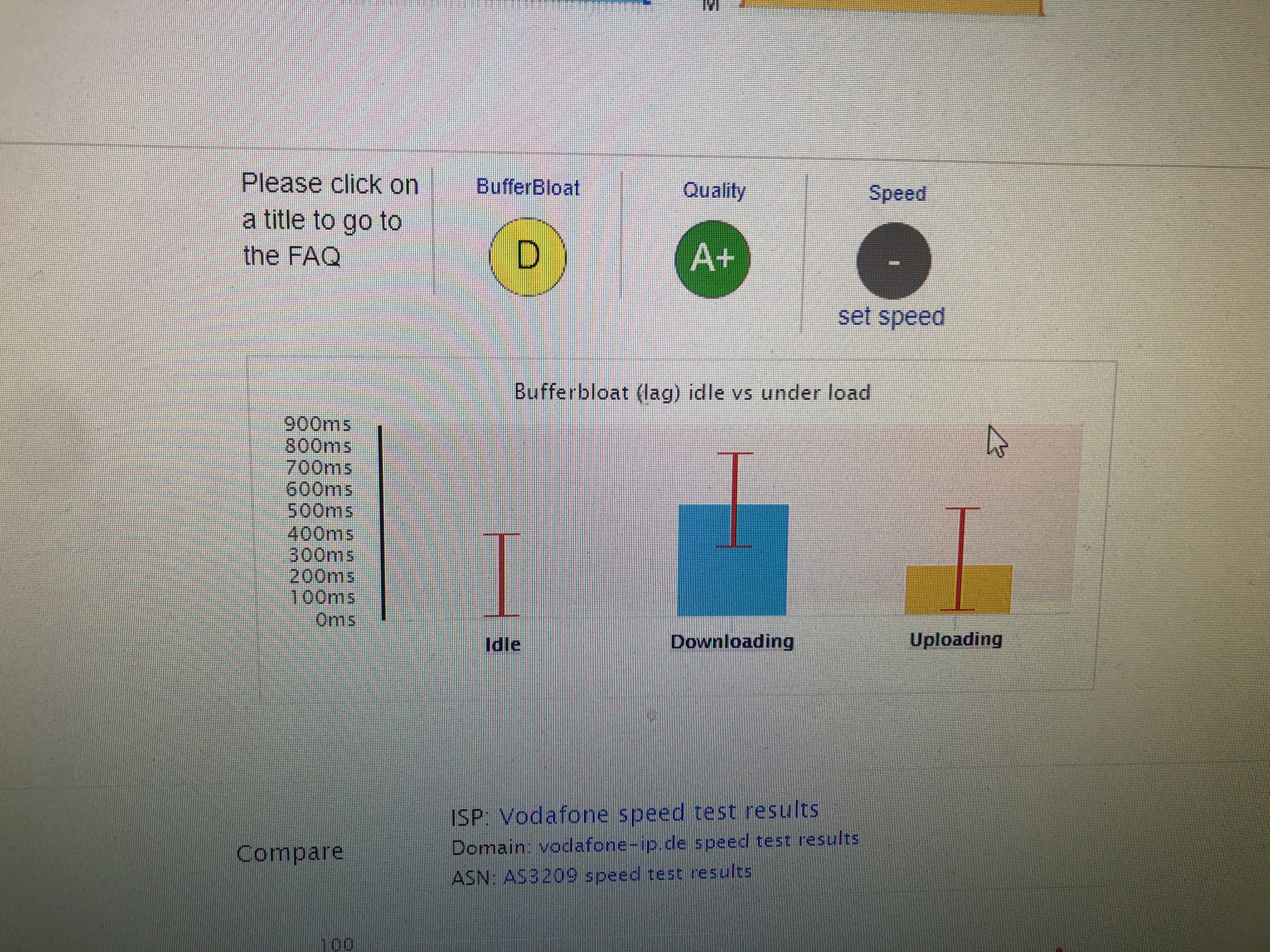 Leider schwanken die zahlen aber enorm bei mir. Manchmal hab ich in Speedtests, 110 mb dann 140mb und 1 Minute später 200mb zum Download und dann sinkt der Wert enorm wieder. Ich habe auf der Seite dslreports.com viele Tests gemacht und bekomme starke Buffer bloats! Im Internet steht, das man Dinge wie eine ps4 priorisieren kann im Netzwerk, auch getan, aber das ändert leider daran nichts.